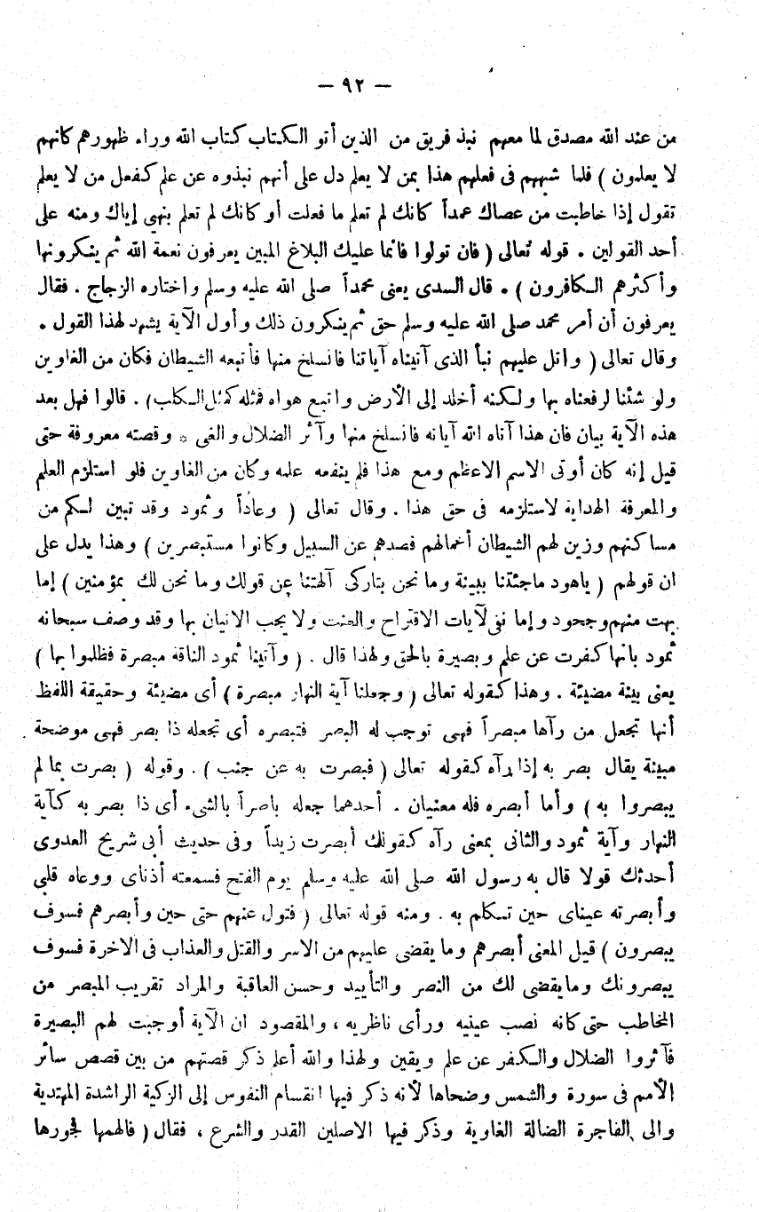 من عِنْد الله مُصدق لمامعهم نبذ فريق من الَّذين اوتوا الْكتاب كتاب الله وَرَاء ظُهُورهمْ كانهم لَا يعلمُونَ فَلَمَّا شبههم فِي فعلهم هَذَا بِمن لَا يعلم دلّ على انهم بنذوه عَن علم كَفعل من لَا يعلم تَقول إِذا خاطبت من عصاك عمدا كانك لم تعلم مَا فعلت اَوْ كانك لم تعلم بنهي إياك وَمِنْه على اُحْدُ الْقَوْلَيْنِ قَوْله تَعَالَى {فَإِن توَلّوا فَإِنَّمَا عَلَيْك الْبَلَاغ الْمُبين يعْرفُونَ نعْمَة الله ثمَّ يُنْكِرُونَهَا وَأَكْثَرهم الْكَافِرُونَ} قَالَ السدى يعْنى مُحَمَّدًا وَاخْتَارَهُ الزّجاج فَقَالَ يعْرفُونَ أَن امْر مُحَمَّد حق ثمَّ يُنكرُونَ ذَلِك وَأول الاية يشْهد لهَذَا القَوْل وَقَالَ تَعَالَى واتل عَلَيْهِم نبأ الَّذِي آتيناه آيَاتنَا فانسلخ مِنْهَا فَأتبعهُ الشَّيْطَان فَكَانَ من الغاوين وَلَو شِئْنَا لرفعناه بهَا وَلكنه اخلد إِلَى الارض وَاتبع هَوَاهُ فَمثله كَمثل الْكَلْب قَالُوا فَهَل بعد هَذِه الاية بَيَان فَإِن هَذَا آتَاهُ الله آيَاته فانسلخ مِنْهَا وآثر الضلال والغي وقصته مَعْرُوفَة حَتَّى قيل إِنَّه كَانَ اوتى الِاسْم الاعظم وَمَعَ هَذَا فَلم يَنْفَعهُ علمه وَكَانَ من الغاوين فَلَو استلزم الْعلم والمعرفة الْهِدَايَة لاستلزمه فِي حق هَذَا وَقَالَ تَعَالَى {وعادا وَثَمُود وَقد تبين لكم من مساكنهم وزين لَهُم الشَّيْطَان أَعْمَالهم فصدهم عَن السَّبِيل وَكَانُوا مستبصرين} وَهَذَا يدل على ان قَوْلهم {يَا هود مَا جئتنا بِبَيِّنَة وَمَا نَحن بتاركي آلِهَتنَا عَن قَوْلك وَمَا نَحن لَك بمؤمنين} إِمَّا بهت مِنْهُم وجحود وَإِمَّا نفي لايات الاقتراح والعنت وَلَا يجب الاتيان بهَا وَقد وصف سُبْحَانَهُ ثَمُود بانها كفرت عَن علم وبصيرة بِالْحَقِّ وَلِهَذَا قَالَ {وآتينا ثَمُود النَّاقة مبصرة فظلموا بهَا} يَعْنِي بَيِّنَة مضيئة وَهَذَا كَقَوْلِه تَعَالَى {وَجَعَلنَا آيَة النَّهَار مبصرة} أَي مضيئة وَحَقِيقَة اللَّفْظ انها تجْعَل من رَآهَا مبصرا فَهِيَ توجب لَهُ الْبَصَر فتبصره أَي تَجْعَلهُ ذَا بصر فَهِيَ مُوضحَة مبينَة يُقَال بصر بِهِ إِذا رَآهُ كَقَوْلِه تَعَالَى {فبصرت بِهِ عَن جنب} وَقَوله {بصرت بِمَا لم يبصروا بِهِ} واما ابصره فَلهُ مَعْنيانِ احدهما جعله باصرا بالشَّيْء أَي ذَا بصر بِهِ كاية النَّهَار وَآيَة ثَمُود وَالثَّانِي بِمَعْنى رَآهُ كَقَوْلِك ابصرت زيدا وَفِي حَدِيث ابي شُرَيْح الْعَدْوى احدثك قولا قَالَ بِهِ رَسُول الله يَوْم الْفَتْح فَسَمعته أذناي ووعاه قلبِي وابصرته عَيْنَايَ حِين تكلم بِهِ وَمِنْه قَوْله تَعَالَى فتول عَنْهُم حَتَّى حِين وأبصرهم فسوق يبصرون قيل الْمَعْنى ابصرهم وَمَا يقْضى عَلَيْهِم من الاسر وَالْقَتْل وَالْعَذَاب فِي الاخرة فَسَوف يبصرونك وَمَا يقْضى لَك من النَّصْر والتأييد وَحسن الْعَاقِبَة وَالْمرَاد تقريب المبصر من الْمُخَاطب حَتَّى كانه نصب عَيْنَيْهِ وَرَأى ناظريه وَالْمَقْصُود ان الاية اوجبت لَهُم البصيرة فآثروا الضلال وَالْكفْر عَن علم ويقين وَلِهَذَا وَالله اعْلَم ذكر قصتهم من بَين قصَص سَائِر الامم فِي سُورَة وَالشَّمْس وَضُحَاهَا لانه ذكر فِيهَا انقسام النُّفُوس الى الزكية الراشدة المهتدية والى الْفَاجِرَة الضَّالة الغاوية وَذكر فِيهَا الاصلين الْقدر وَالشَّرْع فَقَالَ {فألهمها فجورها}