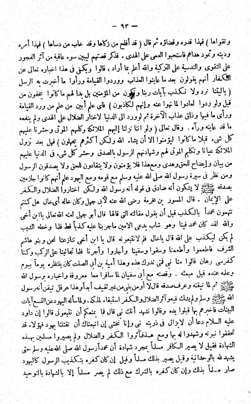 {وتقواها} فَهَذَا قدره وقضاؤه ثمَّ قَالَ {قد أَفْلح من زكاها وَقد خَابَ من دساها} فَهَذَا امْرَهْ وَدينه وَثَمُود هدَاهُم فاستحبوا الْعَمى على الْهدى فَذكر قصتهم ليبين سوء عَاقِبَة منمن آثر الْفُجُور على التَّقْوَى والتدسية على التَّزْكِيَة وَالله اعْلَم بِمَا أَرَادَ قَالُوا ويكفى فِي هَذَا اخباره تَعَالَى عَن الْكفَّار انهم يَقُولُونَ بعد مَا عاينوا الْعَذَاب ووردوا الْقِيَامَة وراوا مَا اخبرت بِهِ الرُّسُل يَا ليتنا نرد وَلَا نكذب بآيَات رَبنَا ونكون من الْمُؤمنِينَ بل بدا لَهُم مَا كَانُوا يخفون من قبل وَلَو ردوا لعادوا لمانهوا عَنهُ وَإِنَّهُم لَكَاذِبُونَ فأبي علم ابين من علم من ورد الْقِيَامَة وَرَأى مَا فِيهَا وذاق عَذَاب الاخرة ثمَّ ورد إِلَى الدُّنْيَا لاختار الضلال على الْهدى وَلم يَنْفَعهُ مَا قد عاينه وَرَآهُ وَقَالَ تَعَالَى وَلَو اننا نزلنَا اليهم الْمَلَائِكَة وكلمهم الْمَوْتَى وحشرنا عَلَيْهِم كل شَيْء قبلا ماكانوا ليؤمنوا الا ان يَشَاء الله وَلَكِن اكثرهم يجهلون فَهَل بعد نزُول الْمَلَائِكَة عيَانًا وتكليم الْمَوْتَى لَهُم وشهادتهم للرسول بِالصّدقِ وَحشر كل شَيْء فِي الدُّنْيَا عَلَيْهِم من بَيَان وإيضاح للحق وَهدى وَمَعَ هَذَا فَلَا يُؤمنُونَ وَلَا ينقادون للحق وَلَا يصدقون الرَّسُول وَمن نظر فِي سيرة رَسُول الله مَعَ قومه وَمَعَ الْيَهُود علم انهم كَانُوا جازمين بصدقه لَا يَشكونَ انه صَادِق فِي قَوْله انه رَسُول الله وَلَكِن اخْتَارُوا الضلال وَالْكفْر على الايمان قَالَ الْمسور بن مخرمَة رضى الله عَنهُ لابي جهل وَكَانَ خَاله أَي خَال هَل كُنْتُم تتهمون مُحَمَّدًا بِالْكَذِبِ قبل ان يَقُول مقَالَته الَّتِي قَالَهَا قَالَ ابو جهل لَعنه الله تَعَالَى يَا ابْن اخي وَالله لقد كَانَ مُحَمَّد فِينَا وَهُوَ شَاب يدعى الامين مَا جربنَا عَلَيْهِ كذبا قطّ فَلَمَّا وخطه الشيب لم يكن ليكذب على الله قَالَ يَا خَال فَلم لَا تتبعونه قَالَ يَا ابْن اخي تنازعنا نَحن بَنو هَاشم الشّرف فاطعموا وأطعمنا وَسقوا وسقينا وأجاروا وأجرنا فَلم تجاثينا على الركب وَكُنَّا كفرسي رهان قَالُوا منا نَبِي فَمَتَى ندرك هَذِه وَهَذَا امية بن ابي الصَّلْت كَانَ ينتظره يَوْمًا بِيَوْم وَعلمه عِنْده قبل مبعثه وقصته مَعَ ابي سُفْيَان لما سافرا مَعًا مَعْرُوفَة واخباره برَسُول الله ثمَّ لما تيقنه وَعرف صدقه قَالَ لَا اومن بِنَبِي من غير ثَقِيف ابدا وَهَذَا هِرقل تَيَقّن انه رَسُول الله وَلم يشك فِيهِ وآثر الضلال وَالْكفْر اسْتِبْقَاء لملكه وَلما سَأَلَهُ الْيَهُود عَن التسع آيَات البيانات فاخبرهم بهَا قبلوا يَده وَقَالُوا نشْهد انك نَبِي قَالَ فَمَا يمنعكم ان تتبعوني قَالُوا إِن دَاوُد عَلَيْهِ السَّلَام دَعَا ان لَا يزَال فِي ذُريَّته نَبِي وَإِنَّا نخشى أَن اتَّبَعْنَاك ان تَقْتُلنَا يهود فَهَؤُلَاءِ قد تحققوا نبوته وشهدوا لَهُ بهَا وَمَعَ هَذَا فآثروا الْكفْر والضلال وَلم يصيروا مُسلمين بِهَذِهِ الشَّهَادَة فَقيل لَا يصير الْكَافِر مُسلما بِمُجَرَّد شَهَادَة ان مُحَمَّدًا رَسُول الله حَتَّى يشْهد لله بالوحدانية وَقيل يصير بذلك مُسلما وَقيل إِن كَانَ كفره بتكذيب الرَّسُول كاليهود صَار مُسلما بذلك وَإِن كَانَ كفره بالشرك مَعَ ذَلِك لم يصر مُسلما إِلَّا بِالشَّهَادَةِ بِالتَّوْحِيدِ