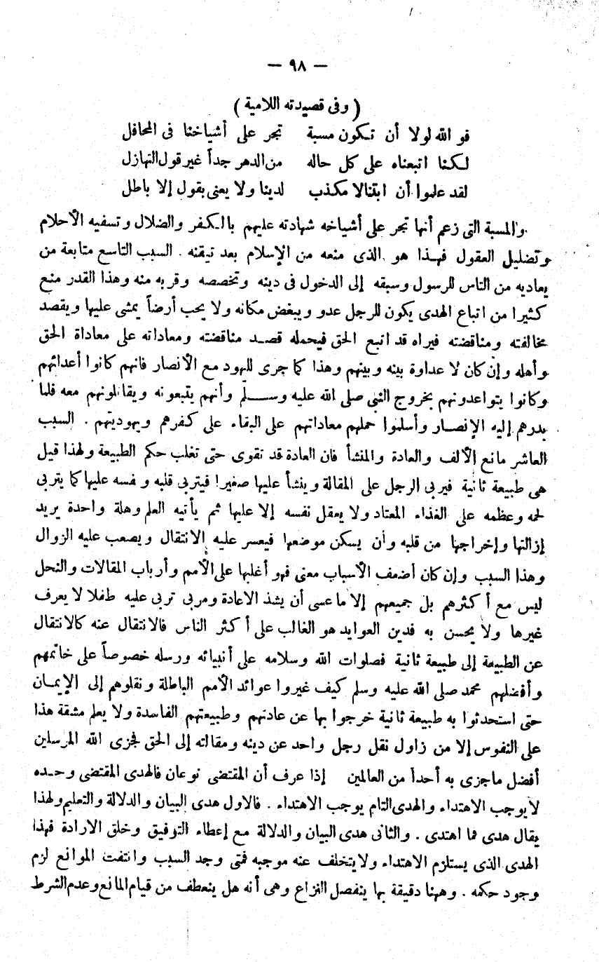 والمسبة الَّتِي زعم انها تجر على اشياخه شَهَادَته عَلَيْهِم بالْكفْر والضلال وتسفيه الاحلام وتضليل الْعُقُول فَهَذَا هُوَ الَّذِي مَنعه من الاسلام بعدتيقنه السَّبَب التَّاسِع مُتَابعَة من يعاديه من النَّاس للرسول وَسَبقه الى الدُّخُول فِي دينه وتخصصه وقربه مِنْهُ وَهَذَا الْقدر منع كثيرا من اتِّبَاع الْهدى يكون للرجل عَدو وَيبغض مَكَانَهُ وَلَا يحب ارضا يمشي عَلَيْهَا ويقصد مُخَالفَته ومناقضته فيراه قد اتبع الْحق فيحمله قصد مناقضته ومعاداته على معاداة الْحق واهله وان كَانَ لَا عَدَاوَة بَينه وَبينهمْ وَهَذَا كَمَا جرى للْيَهُود مَعَ الانصار فانهم كَانُوا اعدائهم وَكَانُوا يتواعدونهم بِخُرُوج النَّبِي وانهم يتبعونه ويقاتلونهم مَعَه فَلَمَّا بدرهم اليه الانصار واسلموا حملهمْ معاداتهم على الْبَقَاء على كفرهم ويهوديتهم السَّبَب الْعَاشِر مَانع الالف وَالْعَادَة والمنشأ فَإِن الْعَادة قد تقوى حَتَّى تغلب حكم الطبيعة وَلِهَذَا قيل هِيَ طبيعة ثَانِيَة فيربى الرجل على الْمقَالة وينشأ عَلَيْهَا صَغِيرا فيتربى قلبه وَنَفسه عَلَيْهَا كَمَا يتربى لَحْمه وعظمه على الْغذَاء الْمُعْتَاد وَلَا يعقل نَفسه الا عَلَيْهَا ثمَّ يَأْتِيهِ الْعلم وهلة وَاحِدَة يُرِيد إِزَالَتهَا وإخراجها من قلبه وان يسكن موضعهَا فيعسر عَلَيْهِ الِانْتِقَال ويصعب عَلَيْهِ الزَّوَال وَهَذَا السَّبَب وَإِن كَانَ اضعف الاسباب معنى فَهُوَ اغلبها على الامم وأرباب المقالات والنحل لَيْسَ مَعَ اكثرهم بل جَمِيعهم إِلَّا مَا عَسى ان يشذ الاعادة ومربي تربى عَلَيْهِ طفْلا لَا يعرف غَيرهَا وَلَا يحسن بِهِ فدين العوايد هُوَ الْغَالِب على أَكثر النَّاس فالانتقال عَنهُ كالانتقال عَن الطبيعة الى طبيعة ثَانِيَة فصلوات الله وَسَلَامه على انبيائه وَرُسُله خُصُوصا على خاتمهم وافضلهم مُحَمَّد كَيفَ غيروا عوائد الامم الْبَاطِلَة ونقلوهم الى الايمان حَتَّى استحدثوا بِهِ طبيعة ثَانِيَة خَرجُوا بهَا عَن عَادَتهم وطبيعتهم الْفَاسِدَة وَلَا يعلم مشقة هَذَا على النُّفُوس الا من زاول نقل رجل وَاحِد عَن دينه ومقالته الى الْحق فجزى الله الْمُرْسلين افضل مَا جزى بِهِ احدا من الْعَالمين إِذا عرف ان الْمُقْتَضى نَوْعَانِ فالهدى الْمُقْتَضى وَحده لَا يُوجب الاهتداء وَالْهدى التَّام يُوجب الإهتداء فالاول هدى الْبَيَان الدّلَالَة والتعليم وَلِهَذَا يُقَال هدى فَمَا اهْتَدَى وَالثَّانِي هدى الْبَيَان وَالدّلَالَة مَعَ إِعْطَاء التَّوْفِيق وَخلق الارادة فَهَذَا الْهدى الَّذِي يسلتزم الاهتداء وَلَا يتَخَلَّف عَنهُ مُوجبه فَمَتَى وجد السَّبَب وانتفت الْمَوَانِع لزم وجود حكمه وَهَهُنَا دقيقة بهَا ينْفَصل النزاع وَهِي انه هَل يَنْعَطِف من قيام الْمَانِع وَعدم الشَّرْط