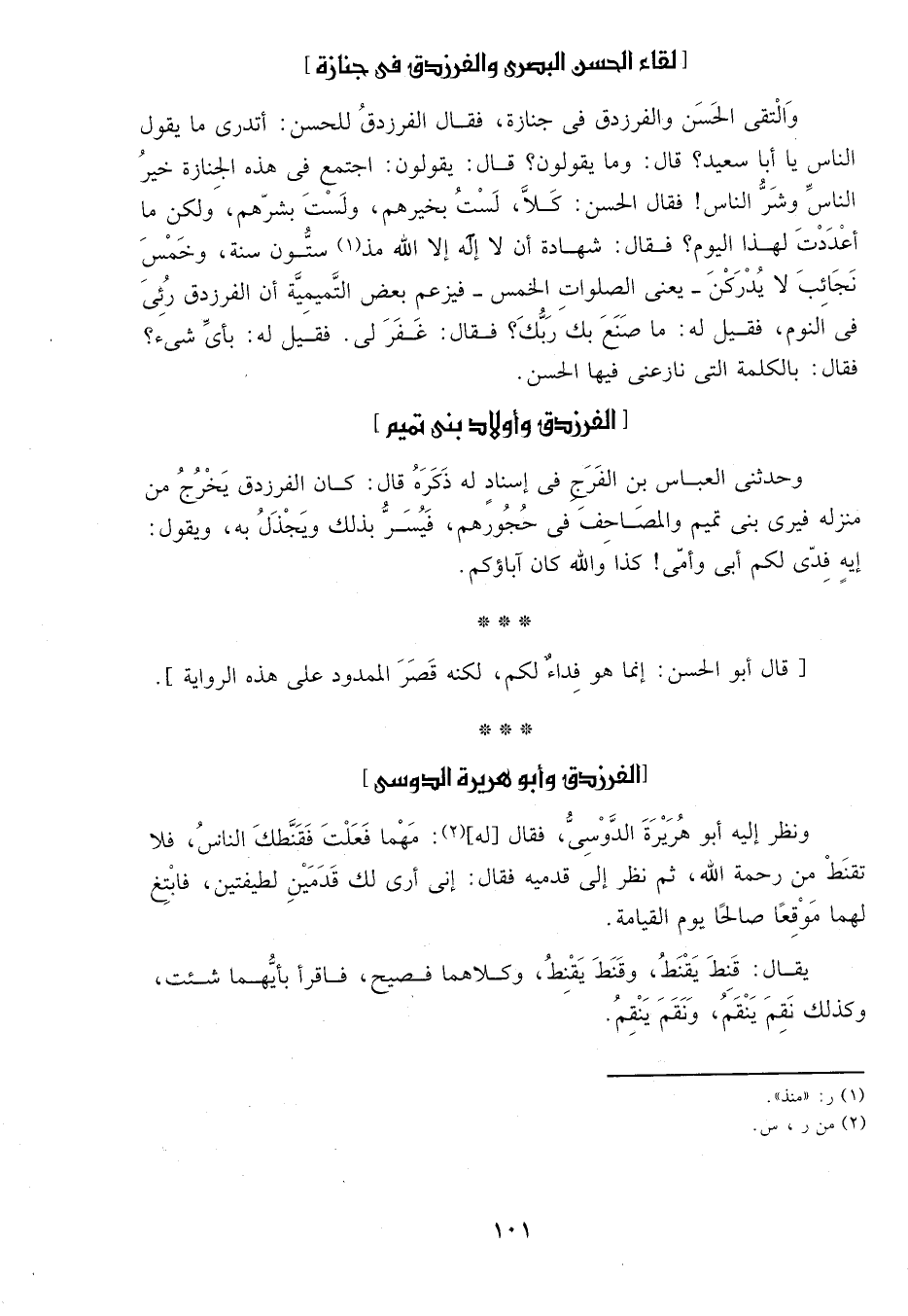 والتقى الحسن والفرزدق في جنازة، فقال الفرزدق للحسن: أتدري ما يقول الناس يا أبا سعيد? قال: وما يقولون? قال: يقولون?: اجتمع في هذه الجنازة خير الناس وشر الناس! فقال الحسن: كلا، لست بخيرهم، ولست بشرهم، ولكن ما أعددت لهذا اليوم? فقال: شهادة أن لا إله إلا الله مذ1 ستون سنة، وخمس نجائب لا يدركن- يعني الصلوات الخمس- فيزعم بعض التميمية أن الفرزدق رئي في النوم، فقيل له: ما صنع بك ربك? فقال: غفر لي. فقيل له: بأي شيء فقال: بالكلمة التي نازعني فيها الحسن.