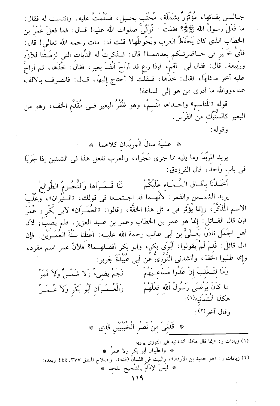 يريد الشمس والقمر: لأنهما قد اجتمعا في قولك، "النيران"، وغلب الاسم المذكر، وإنما يؤثر في مثل هذا الخفة، وقالوا: "العمران" لأبي بكر وعمر، فإن قال قائل: إنما هو عمر بن الخطاب وعمر بن عبد العزيز، فلم يصب، لأن أهل الجمل نادوا بعلي بن أبي طالب رحمة الله عليه: أعطنا سنة العمرين. فإن قال قائل: فلم لم يقولوا: أبوي بكر، وأبو بكر أفضلهما فلأن عمر اسم مفرد، وإنما طلبوا الخفة. وأنشدني التوزي عن أبي عبيدة لجرير:
