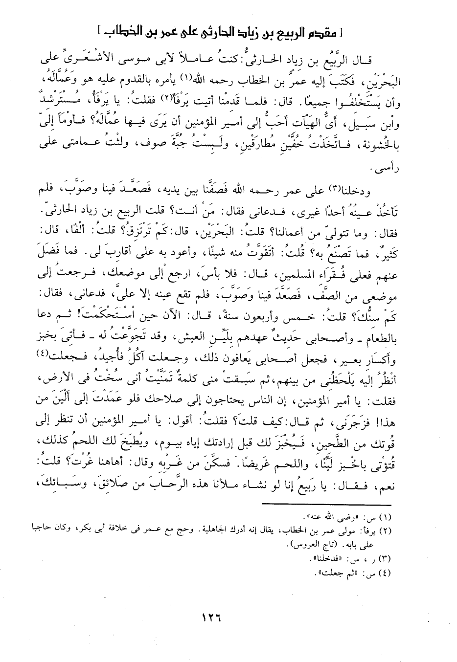 ودخلنا3 على عمر رحمه الله فصفنا بين يديه فصعد فينا وصوب، فلم تأخذ عينه أحداً غيري، فدعاني فقال: من أنت قلت: الربيع بن زياد الحارثي، فقال: وما تتولى من أعمالنا قلت: البحرين قال: كم ترتزق قلت: ألفا، قال: كثير، فما تصنع به قلت: أتقوت منه شيئا، وأعود به على أقارب لي. فما فضل عنهم فعلى فقراء المسلمين، قال: فلا بأس، ارجع إلى موضعك، فرجعت إلى موضعي من الصف، فصعد فينا وصوب، فلم تقع عينه إلا علي، فدعاني، فقال: كم سناك، قلت: خمس وأربعون سنة، قال: الآن حين استحكمت ثم دعا بالطعام وأصحابي حديث عهدهم بلين العيش، وقد تجوعت له فأتي بخبز وأكسار بعير، فجعل أصحابي يعافون ذلك، وجعلت آكل فأجيد، فجعلت4 أنظر إليه المؤمنين، إن الناس يحتاجون إلى صلاحك فلو عمدت إلى ألين من هذا فزجرني، ثم قالك كيف قلت؟ فقلت: أقول: ياأمير المؤمنين أن تنظر إلى قوتك من الطحين، فيخبز لك قبل إرادتك إياه بيوم، ويطبخ لك اللحم كذلك، فتؤتى بالخبز لينا، واللحم غريضاً. فسكن من غربه وقال: أههنا غرت قلت: نعم، فقال: يا ربيع إنا لو نشاء ملأنا هذه الرحاب من صلائق، وسبائك،
