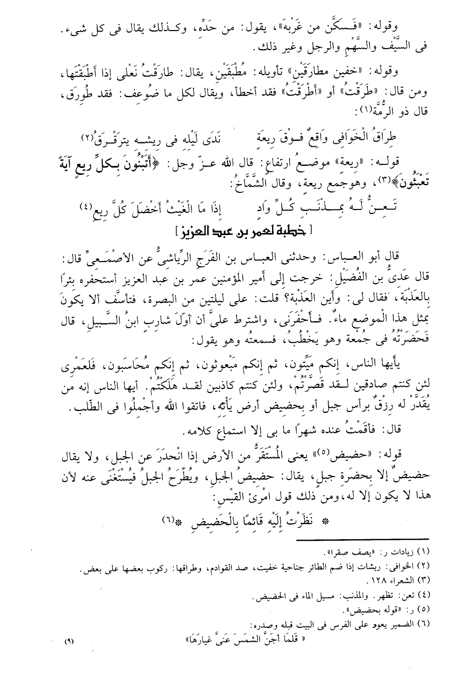 قال أبو العباس: وحدثني العباس بن الفرج الرياشي عن الأصمعي قال: قال عدي بن الفضيل: خرجت إلى أمير المؤمنين عمر بن عبد العزيز إستحفره بئراً بالعذبة، فقال لي: وأين العذبة؟ قلت: على ليلتين من البصرة، فتأسف ألا يكون بمثل هذا الموضع ماء فأحفرني، واشترط علي أن أول شارب ابن السبيل، قال فحضرته في جمعة، وهو يخطب، فسمعه وهو يقول:
