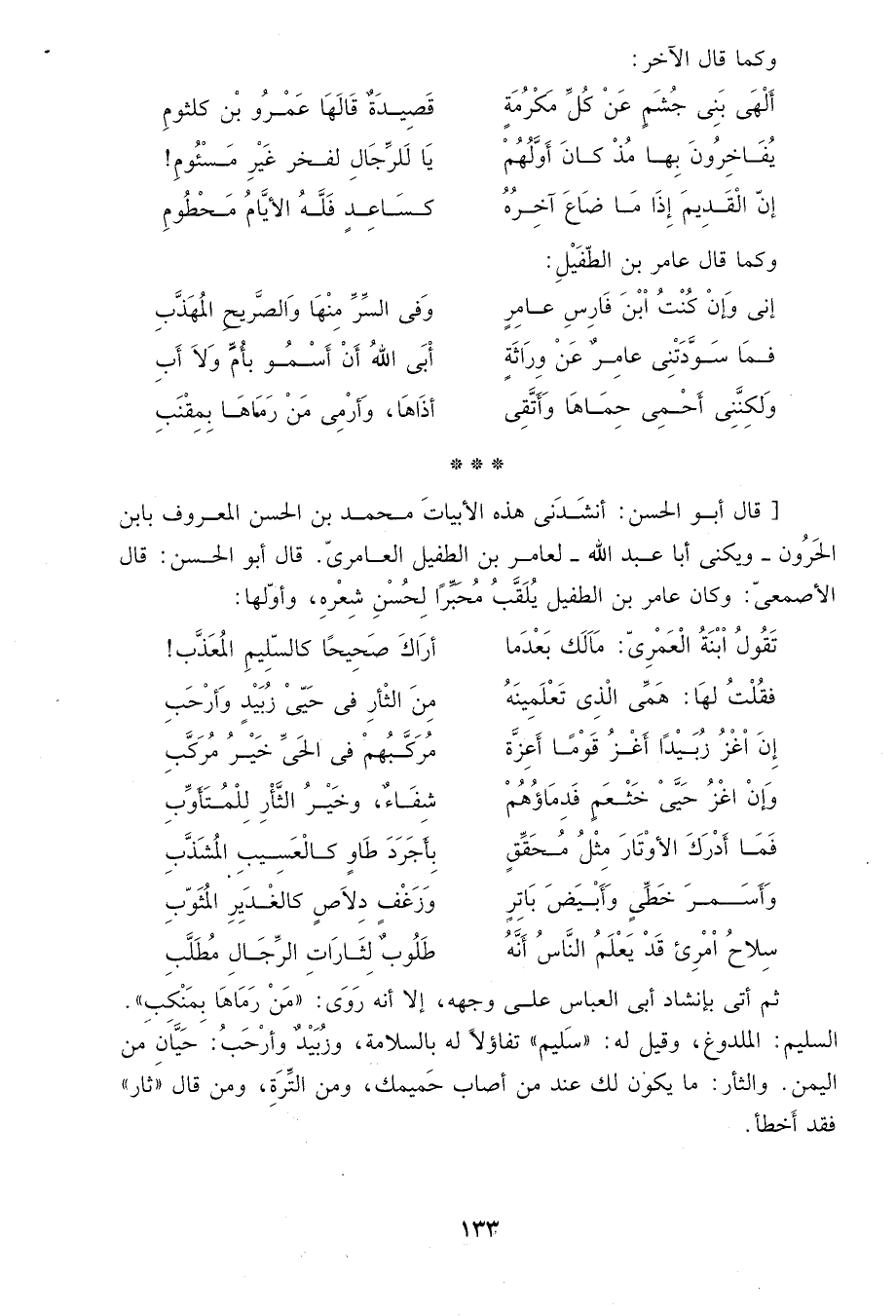 قال أبو الحسن: أنشدني هذه الأبيات محمد بن الحسن المعروف بابن الحرون ويكنى أبا عبد الله لعامر بن الطفيل العامري. قال أبو الحسن: قال الأصمعي: وكان عامر بن الطفيل يلقب محبراً لحسن شعره، وأولها: