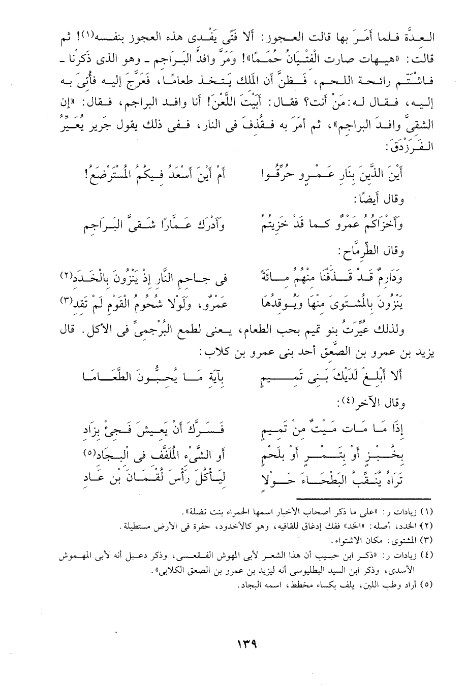 العدة، فلما أمر بها قالت العجوز: ألا فتى يفدي هذه العجوز بنفسه1! ثم قالت: "هيهات صارت الفتيان حمماً"! ومر وافد البراجموهو الذي ذكرنا - فاشتم رائحة اللحم، فظن أن الملك يتخذ طعاماً، فعرج إليه فأتي به إليه، فقال له: من أنت? فقال: ابيت اللعن? أنا وافد البراجم، فقال: "إن الشقي وافد البراجم". ثم أمر به فقذف في النار، ففي ذلك يقول جرير يعير الفرزدق: