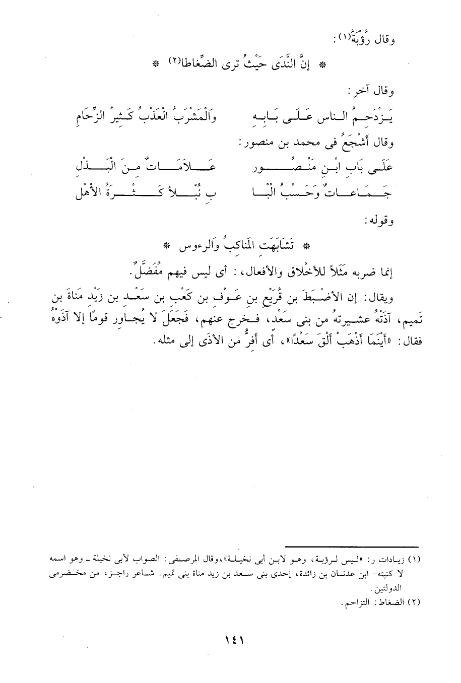 1 زيادات ر: "ليس لرؤبة، وهو لابن أبى نخيلة"، وقال المرصفى: الصواب لأبى نخيلة-وهو اسمه لا كنيته-ابن عدنان بن زائدة، إحدى بني سعد بن زيد مناة بنى تميم. شاعر راجز، من مخضرمى الدولتين.