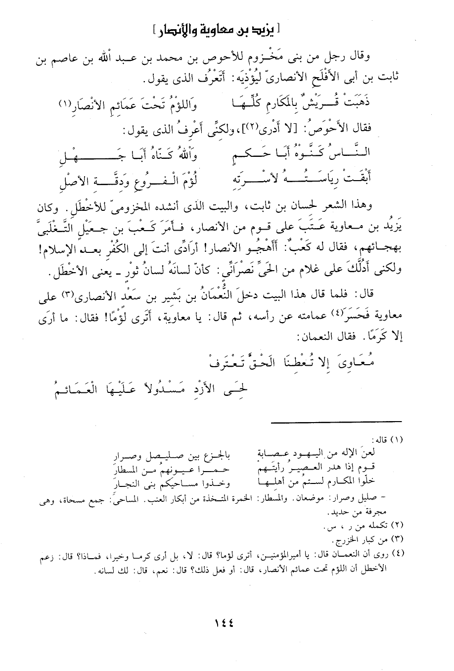 4 روى أن النعمان قال: يا أمير المؤمنين، أترى لؤما؟ قال: لا، بل أرى كرما وخيرا، فماذا؟ قال: زعم الأخطل أن اللؤم تحت عمائم الأنصار، قال: أو فعل ذلك؟ قال: نعم، قال: لك لسانه.
