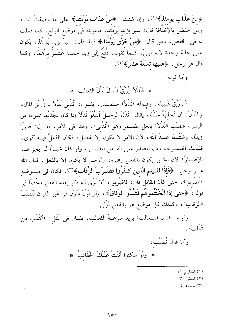 فزريق قبيلة. وقوله" ندلاً" مصدر، يقول، اندلي ندلاً يا زريق المال، والندل: أن تجذبه جذباً، يقال: ندل الرجلا الدلو ندلاً إذا كان يجذبها مملوءة من البئر، فنصب" ندلاً "بفعل مضمر وهو" أندلي "وهذا في الأمر، تقول: ضرباً زيداً، وشتما عبد الله، لأن الأمر لا يكون إلا بفعل، فكان الفعل فيه أقوى، فلذلك أضمرته، ودل المصدر على الفعل المضمر، ولو كان خبراً لم يجز فيه الإضمار، لأن الخبر يكون بالفعل وغيره، والأمر لا يكون إلا بالفعل، قال الله عز وجل: {فَإِذَا لَقِيتُمُ الَّذِينَ كَفَرُوا فَضَرْبَ الرِّقَابِ} 3. فكان في موضع "اضربوا"، حتى: كان القائل قال: فاضربوا، ألا ترى أنه ذكر بعده محضاً في قوله: {حَتَّى إِذَا أَثْخَنْتُمُوهُمْ فَشُدُّوا الْوَثَاقَ} ولو نون منون في غير القرآن لنصب "الرقاب" وكذلك كل موضع هو بالفعل أولى.