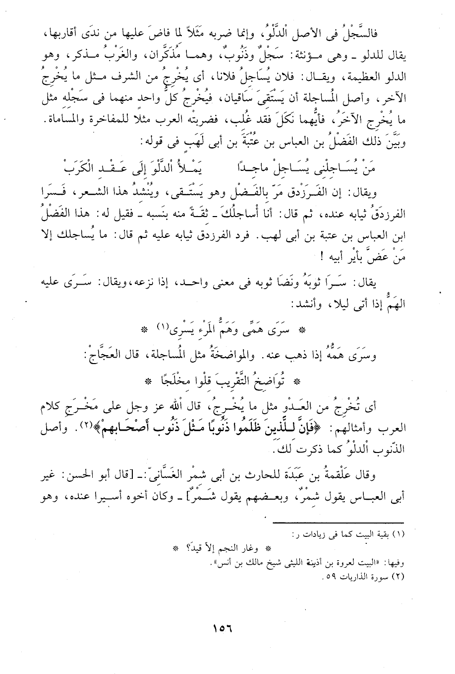 ويقال: إن الفرزدق مر بالفضل وهو يستقي، وينشد هذا الشعر، فسرا الفرزدق ثيابه عنده، ثم قال: أنا أساجلك- ثقةً منه بنسبه- فقيل له: هذا الفضل بن عباس بن عتبة بن أبي لهب. فرد الفرزدق ثيابه عليه ثم قال: ما يساجلك إلا من عض بأير أبيه. يقال: سرا ثوبه ونضا ثوبه في معنى واحد، إذا نزعه، ويقال: سرى عليه الهم إذا أتى ليلاً، وأنشد: