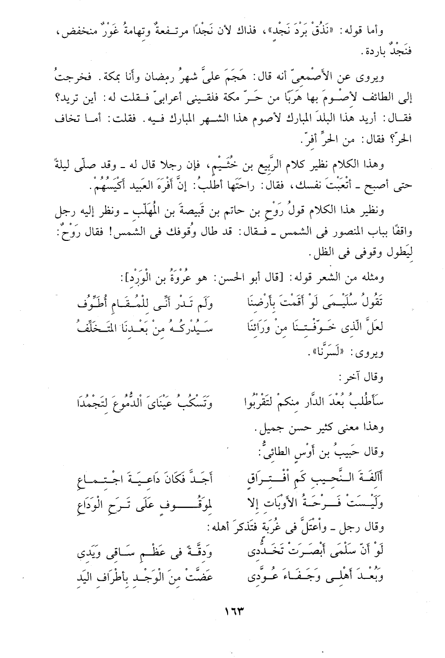 ويروى عن الأصمعي أنه قال: هجم علي شهر رمضان وأنا بمكة، فخرجت إلى الطائف لأصوم بها هرباً من حر مكة فلقيني أعرابي فقلت له: أين تريد? فقال: أريد هذا البلد المبارك لأصوم هذا الشهر المبارك فيه. فقلت له: أما تخاف الحر? فقال من الحر أفر.