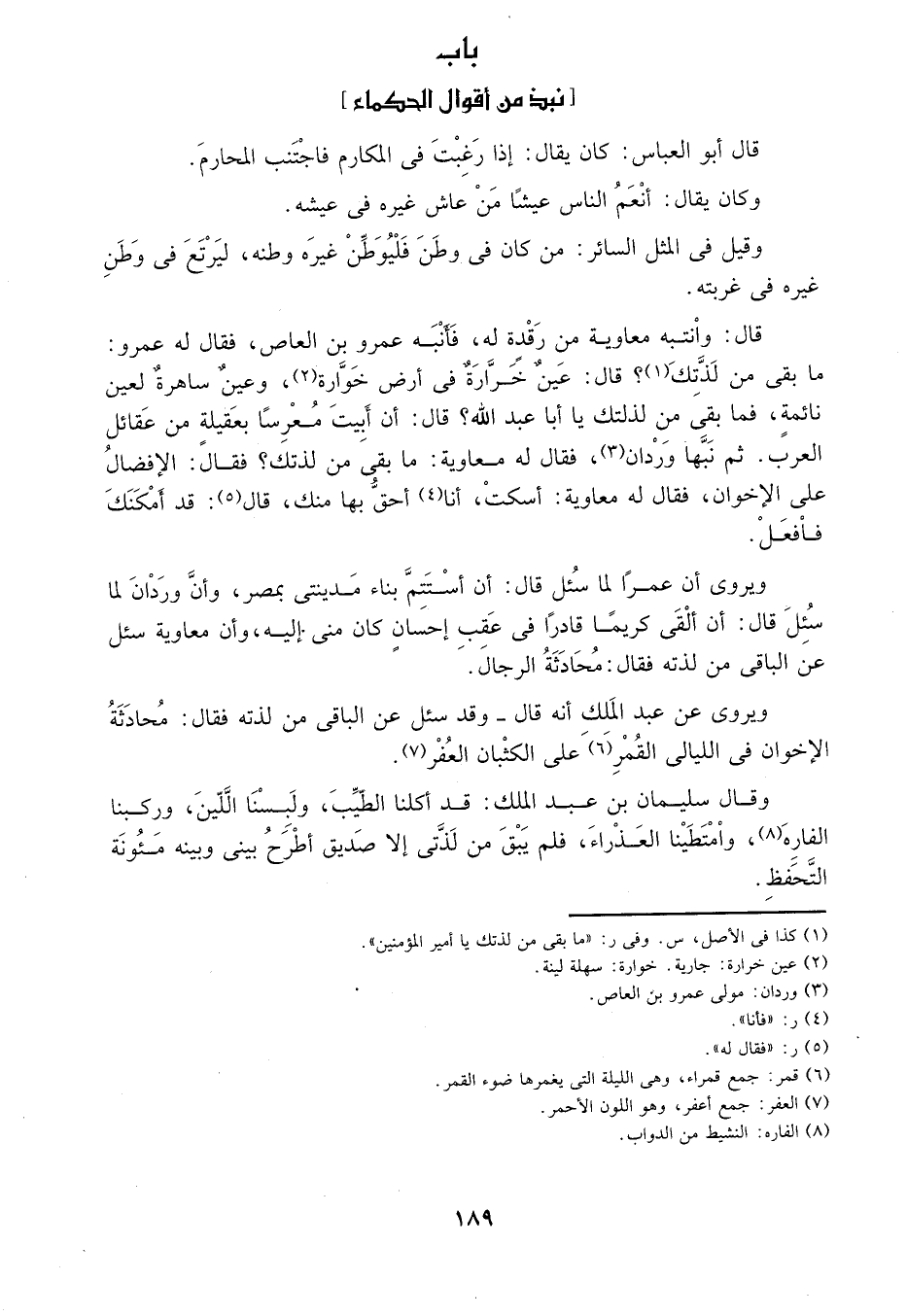 قال: وأنتبه معاوية من رقدةٍ له، فأنبه عمرو بن العاص، فقال له عمرو: ما بقي من لذتك1? قال: عينٌ خرارة في أرض خوارة2، وعينٌ ساهرة لعينٌ نائمة، فما بقي من لذتك يا أبا عبد الله? قال: أن أبيت معرساً بعقيلة من عقائل العرب. ثم نبها وردان3، فقال له معاوية: ما بقي من لذتك? فقال: الإفضال على الإخوان، فقال له معاوية: اسكت، أنا4 أحق بها منك، قال5: قد أمكنك فافعل.