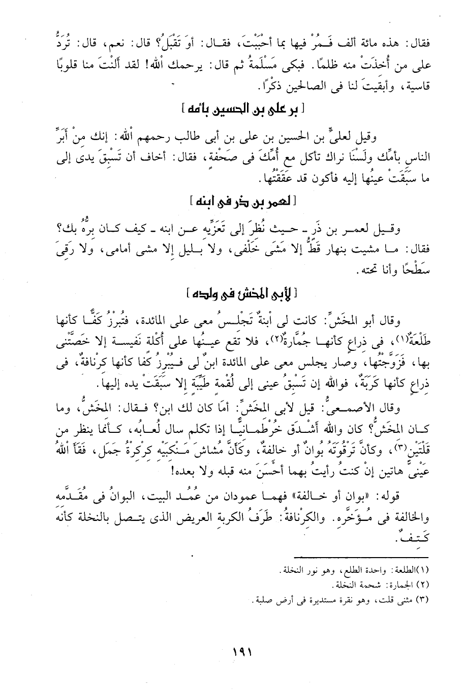 وقيل لعلي بن الحسين بن علي بن أبي طالب رحمهم الله: إنك من أبر الناس بأمك ولسنا نراك تأكل مع أمك في صحفةٍ، فقال: أخاف أن تسبق يدي إلى ما قد سبقت عينها إليه فأكون قد عققتها.