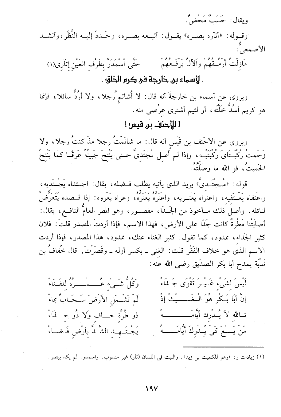 ويروى عن أسماء بن خارجة أنه قال: لا أشاتم رجلاً، ولا أرد سائلاً، فإنما هو كريم أسد خلته، أو لئيم أشتري عرضي منه.