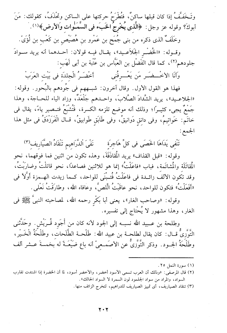 2 قال المرصفى: "وذلك أن العرب تسمى الأسود أخضر، والأخضر أسود، لما أن الخضرة إذا اشتدت تقارب السواد، والمراد من سود الجلمود لون السمرة لا السواد الحالك".