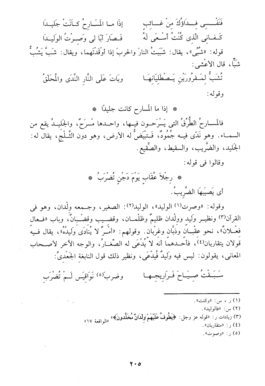 ونظير وليد وولدان ظليم وظلمان، وقضيب وقضبان، وباب" فعال فعلان"، نحو عقبان وذبان وغربان. وقولهم: "أمر لاينادى وليده"، يقال فيه قولان يتقاربان4، فأحدهما أنه لا يدعى له الصغار، والوجه الآخر لأصحاب المعاني، يقولون: ليس فيه وليد فيدعى، ونظير ذلك قول النابغة الجعدي: