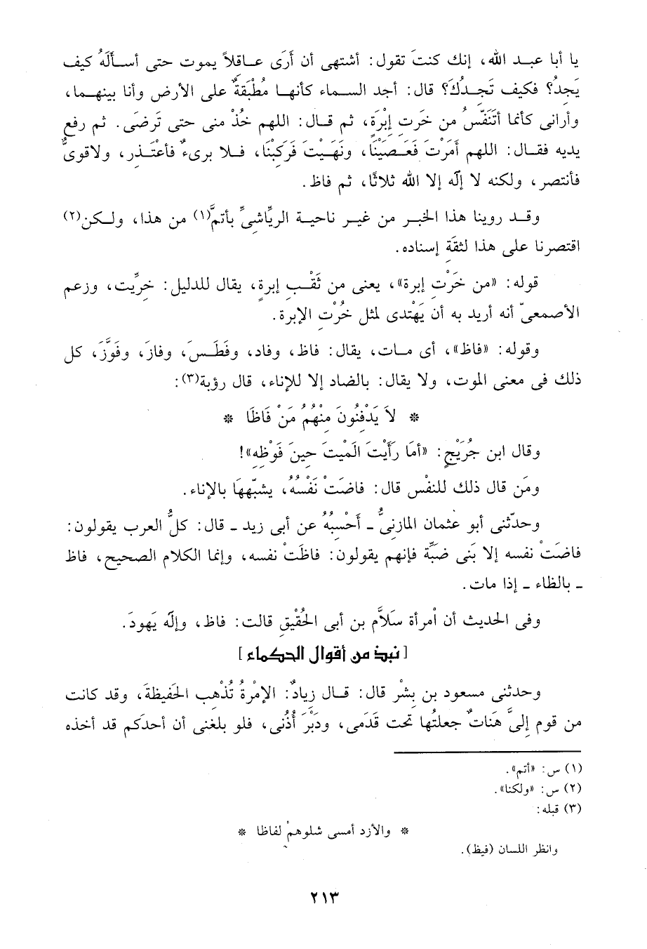 وحدثني أبو عثمان المازني أحسبه عن أبي زيد قال: كل العرب يقولون: فاضت نفسه إلا بني ضبة فإنهم يقولون: فاظت نفسه، وإنما الكلام الصحيح فاظ بالظاء إذا مات.