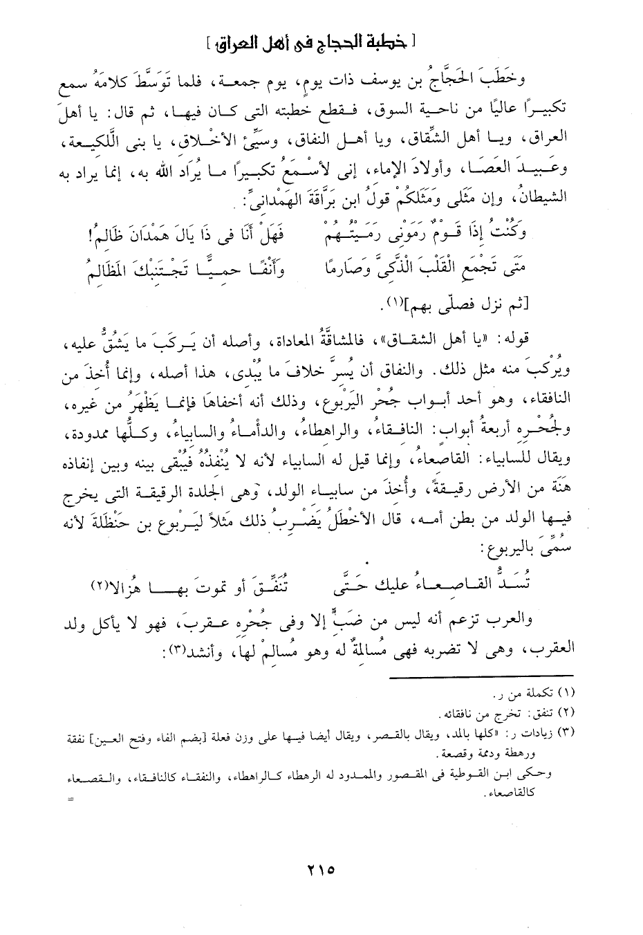 وخطب الحجاج بن يوسف ذات يوم، يوم جمعة، فلما توسط كلامه سمع تكبيراً عالياً من ناحية السوق، فقطع خطبة التي كان فيها، ثم قال: يا أهل العراق، ويا أهل الشقاق، ويا أهل النفاق، وسيئي الأخلاق، يا بني اللكيعة، وعبيد العصا، وأولاد الإماء، إني لأسمع تكبيراً ما يراد الله به، إنما يراد به الشيطان، وإن مثلي ومثلكم قول ابن براقة الهمداني: