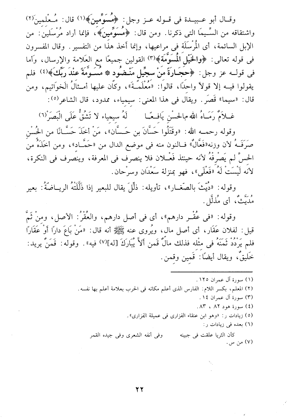 وقال أبو عبيدة في قوله عز وجل: {مُسَوِّمِينَ} 1" قال: معلمين2 واشتقاقه من السيما التي ذكرنا. ومن قال: {مُسَوِّمِينَ} ، فإنما أراد مرسلين: من الإبل السائمة: أي المرسلة في مراعيها، وإنما أخذ هذا من التفسير. قال المفسرون في قوله تعالى: " {وَالْخَيْلِ الْمُسَوَّمَةِ} 3، القولين جميعاً، مع العلامة والإرسال، وأما في قوله عز وجل: {حِجَارَةً مِنْ سِجِّيلٍ مَنْضُودٍ، مُسَوَّمَةً عِنْدَ رَبِّكَ} 4 فلم يقولوا فيه إلا قولاً واحداً، قالوا: "معلمة"، وكان عليها أمثال الخواتيم، ومن قال: "سيما" قصر. ويقال في هذا المعنى: سيمياء، ممدود، قال الشاعر5: