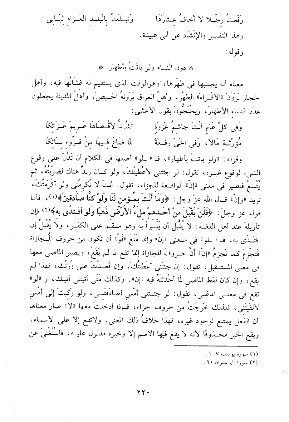 وقوله: "ولو باتت بأطهار"، ف" لو" أصلها في الكلام أن تدل على وقوع الشيء لوقوع غيره، تقول: لو جئتني لأعطيك، ولو كان زيد هناك لضربته، ثم يتسع فتصير في معنى" إن" الواقعة للجزاء تقول: أنت لا تكرمني ولو أكرمتك، تريد"وإن" قال الله عز وجل: {وَمَا أَنْتَ بِمُؤْمِنٍ لَنَا وَلَوْ كُنَّا صَادِقِينَ} 1، فأما قوله عز وجل: {فَلَنْ يُقْبَلَ مِنْ أَحَدِهِمْ مِلءُ الْأَرْضِ ذَهَباً وَلَوِ افْتَدَى بِهِ} 2 فإن تأويله عند أهل اللغة: لا يقبل أن يتبرأ به وهو مقيم على الكفر، ولا يقبل إن افتدى به، فـ"لو" في معنى "إن" وإنما منع "لو" أن تكون من حروف المجازاة فتجزم كما تجزم "إن" أن حروف المجازاة إنما تقع لما لم يقع، ويصير الماضي معها في معنى المستقبل تقول: إن جئتني أعطيتك، وإن قعدت عني زرتك، فهذا لم يقع.،وإن كان لفظ الماضي لما أحدثته فيه "إن "وكذلك متى أتيتني أتيتك، و"لو" تقع في معنى الماضي، تقول: لو جئتني أمس لصادفتني، ولو ركبت إلي أمس لألفيتني، فلذلك خرجت من حروف الجزاء، فإذا أدخلت معها "لا" صار معناها أن الفعل يمتنع لوجود غيره، فهذا خلاف ذلك المعنى، ولا تقع إلا على الأسماء، ويقع الخبر محذوفاً لأنه لا يقع فيها الأسم إلا وخبره مدلول عليه، فاستغني عن