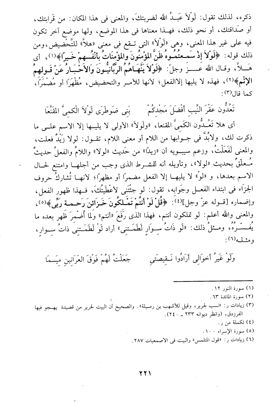 أي هلا تعدون الكمي المقنعا،"ولولا "الأولى لا يليها إلا الاسم على ما ذكرت لك.،ولا بد في جوابها من اللام أو معنى اللام، تقول: لولا زيدٌ فعلت، والمعنى لفعلت، وزعم سيبويه أن"زيداً "من حديث "لولا" واللام والفعل حديثٌ معلقٌ بحديث "لولا"، وتأويله أنه للشرط الذي وجب من أجلها وامتنع لحال الاسم بعدها، و"لو "لا يليها إلا الفعل مضمراً أو مظهراً.، لأنها تشارك حروف الجزاء في ابتداء الفعل وجوابه، تقول: لو جئتني لأعطيتك.، فهذا ظهور الفعل، وإضماره، قوله عز وجل4: {قُلْ لَوْ أَنْتُمْ تَمْلِكُونَ خَزَائِنَ رَحْمَةِ رَبِّي} 5. والمعنى والله أعلم: لو تملكون أنتم.، فهذا الذي رفع "أنتم" ولما أضمر ظهر بعده ما يفسره، ومثل ذلك: "لو ذات سوارٍ لطمتني" أراد لو لطمتني ذات سوارٍ، ومثله6: