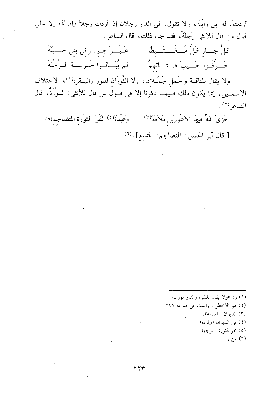 ولا يقال للناقة والجمل جملان، ولا الثوران للثور والبقرة1، لاختلاف الاسمين، إنما يكون ذلك فيما ذكرنا إلا في قول من قال للأنثى: ثورةٌ، قال الشاعر2:
