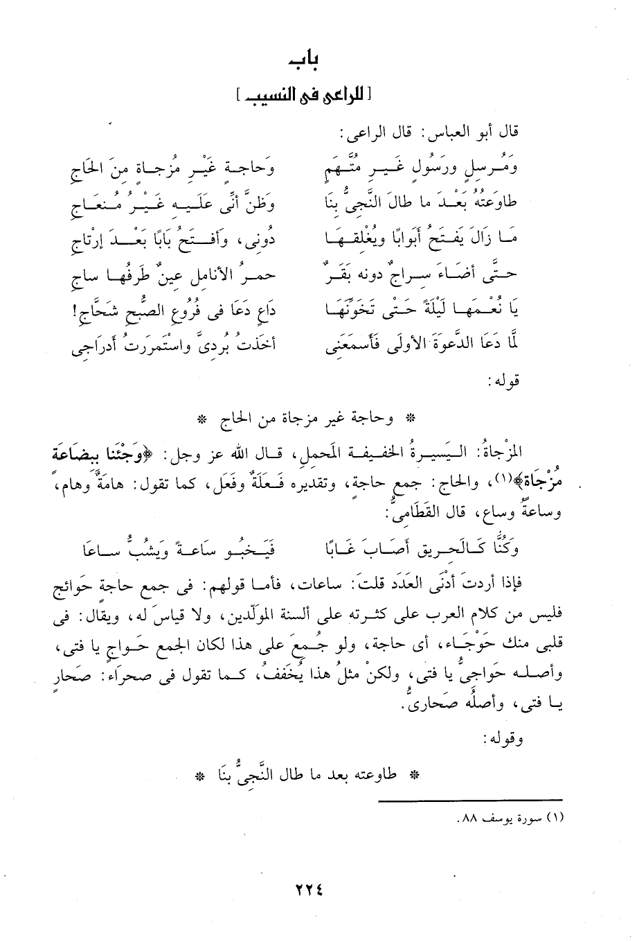 المزجاة: اليسيرة الخفيفة المحمل، قال الله عز وجل: {وَجِئْنَا بِبِضَاعَةٍ مُزْجَاةٍ} 1، والحاج: جمع حاجةٍ، وتقديره فعلةٌ وفعل، كما تقول: هامةٌ وهام، وساعة وساع، قال القطامي: