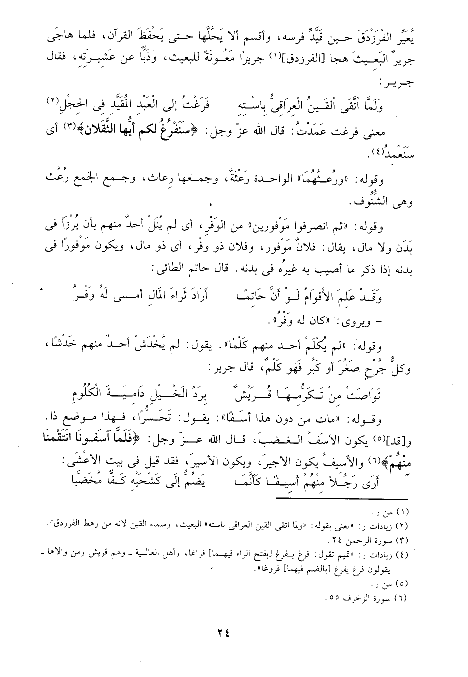 2 زيادات ر: "يعني بقوله: "ولما اتقى القين العراقي باسته" البعيث، وسماه القين لأنه من رهط الفرزدق".