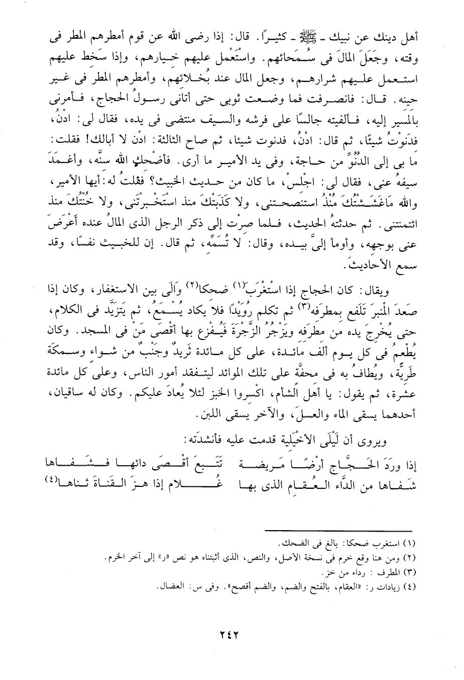 أهل دينك عن نبيك "صَلَّى اللَّهُ عَلَيْهِ وَسَلَّمَ" كثيراً، قال: إذا رضي الله عن قوم أمطرهم المطر في وقته، وجعل المال في سمحائهم، واستعمل عليهم خيارهم، وإذا سخط عليهم استعمل عليهم شرارهم، وجعل المال عند بخلائهم، وأمطرهم المطر في غير حينه. قال: فانصرفت فما وضعت ثوبي حتى أتاني رسول الحجاج، فأمرني بالمسير إليه، فالفيته جالساً على فرشه والسيف منتضىً في يده، فقال لي: ادن، فدنوت شيئاً، ثم قال: ادن، فدنوت شيئاً، ثم صاح الثالثة: ادن لا أبا لك! فقلت: ما بي إلى الدنو من حاجة، وفي يد الأمير ما أرى. فأضحك الله سنه، وأغمد سيفه عني، فقال لي: اجلس، ما كان من حديث الخبيث? فقلت له: أيها الأمير، والله ما غششتك منذ استنصحتني، ولا كذ بتك منذ استخبرتني، ولا خنتك منذ ائتمنتني. ثم حدثته الحديث، فلما صرت إلى ذكر الرجل الذي المال عنده أعرض عني بوجهه، وأومأ إلي بيده، وقال: لا تسمه، ثم قال: إن للخبيث نفساً، وقد سمع الأحاديث.