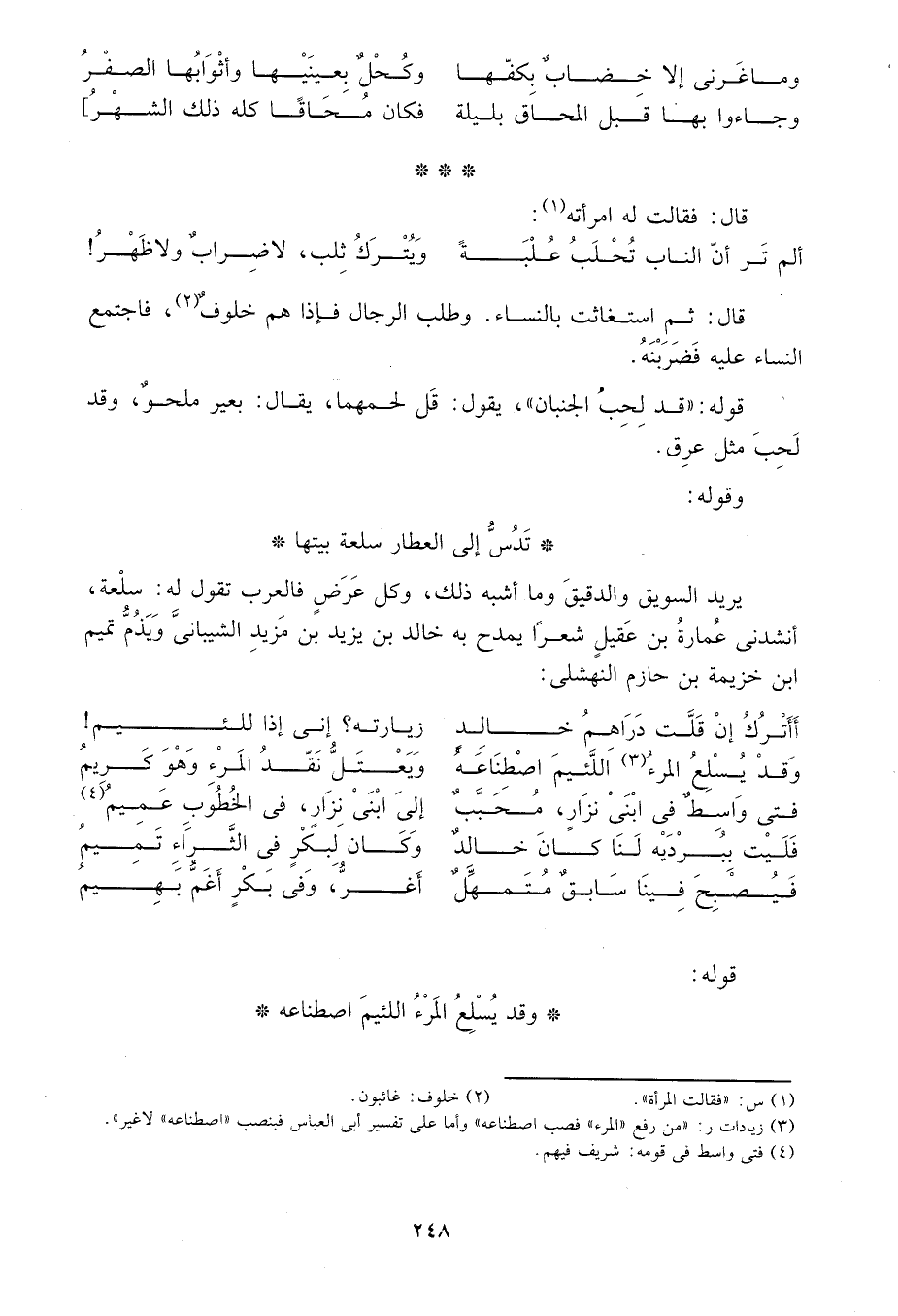 يريد السويق والدقيق وما أشبه ذلك، وكل عرضٍ فالعرب تقول له: سلعة، أنشدني عمارة بن عقيل شعراٌ يمدح به خالد بن يزيد بن مزيد الشيباني ويذم تميم ابن خزيمة بن حازم النهشلي: