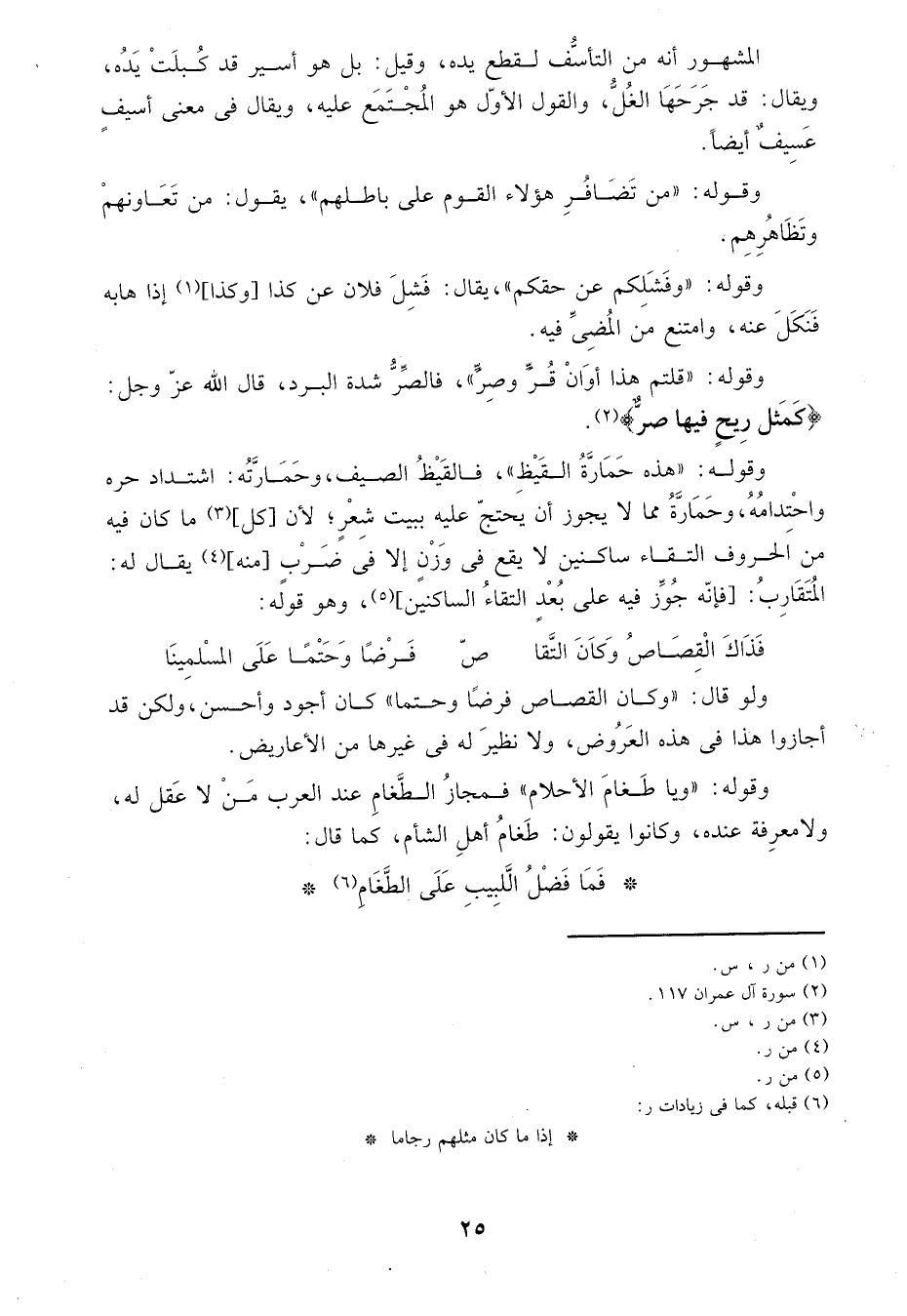 وقوله: "وفشلكم عن حقكم"، يقال: فشل فلان عن كذا و"كذا"1 إذا هابه فنكل عنه وامتنع من المضي فيه. وقوله:" قلتم هذا أوان فر وصر"،فالصر شدة البرد, قال الله عز وجل {كَمَثَلِ رِيحٍ فِيهَا صِرٌّ} 2.