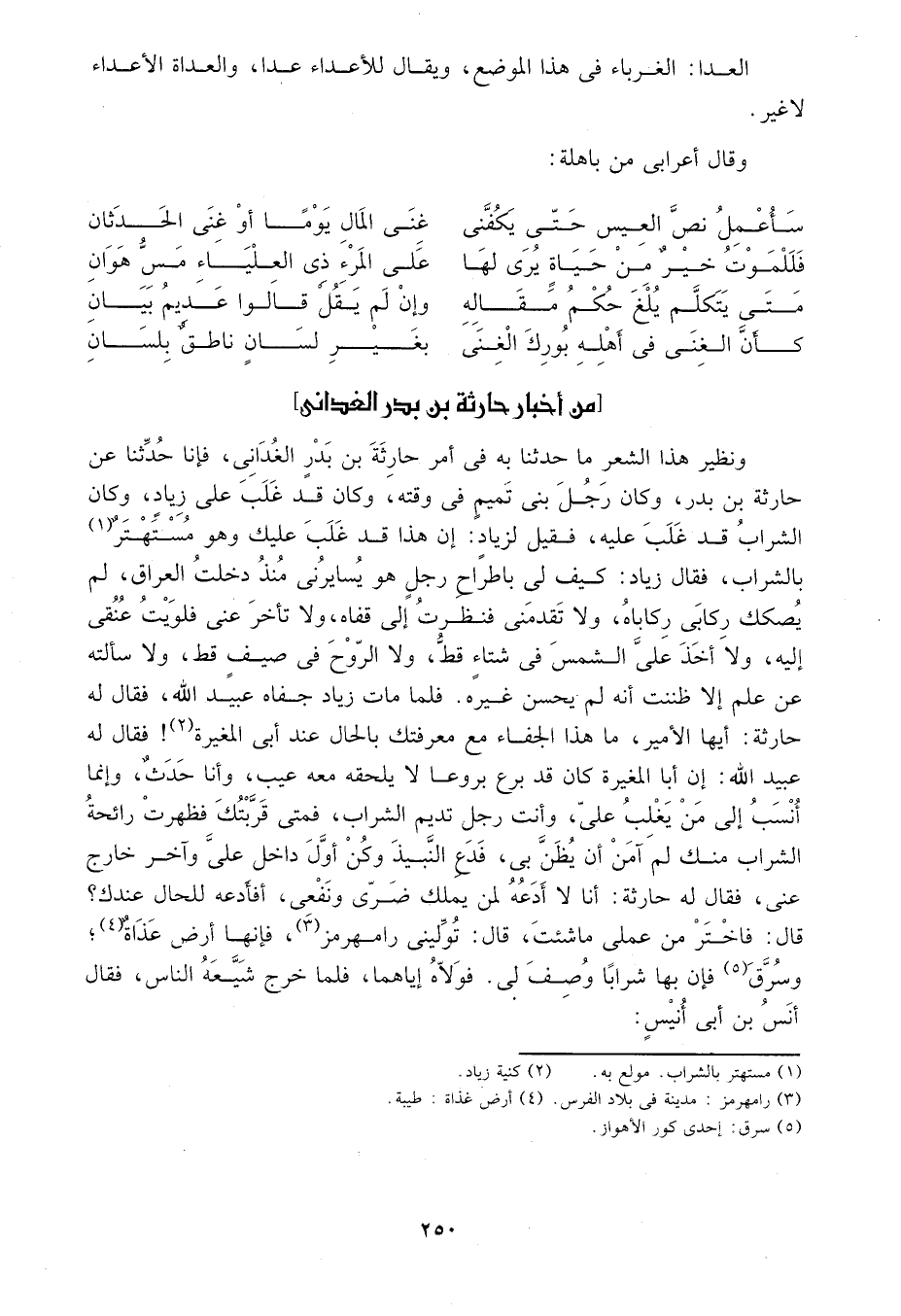 ونظير هذا الشعر ما حدثنا به في أمر حارثة بن بدرٍ الغداني، فإنا حدثنا عن حارثة بن بدر، وكان رجل بني تميم في وقته. وكان قد غلب على زيادٍ، وكان الشراب قد غلب عليه، فقيل لزيادٍ: إن هذا قد غلب عليك وهو مستهترٌ1 بالشراب، فقال زياد: كيف لي بأطراح رجلٍ هو يسايرني منذ دخلت العراق، لم يصكك ركابي ركباه، ولا تقدمني فنظرت إلى قفاه، ولا تأخر عني فلويت عنقي إليه، ولا أخذ علي الشمس في شتاءٍ قط، ولا الروح في صيف قط، ولا سألته عن علم إلا ظننت أنه لم يحسن غيره. فلما مات زيادٌ جفاه عبيد الله، فقال له حارثة: أيها الأمير، ما هذا الجفاء مع معرفتك بالحال عند أبي المغيرة2 فقال له عبيد الله: إن أبا المغيرة كان قد برع بروعاً لا يلحقه معه عيب، وأنا حدثٌ، وإنما أنسب إلى من يغلب علي، وأنت رجل تديم الشراب، فمتى قربتك فظهرت رائحة الشراب منك لم آمن أن يظن بي، فدع النبيذ وكن أول داخل علي وآخر خارج عني، فقال له حارثة: أنا لا أدعه لمن يملك ضري ونفعي، أفأدعه للحال عندك قال: فاختر من عملي ما شئت، قال: توليني رامهرمز3، فإنها أرض عذاةٌ4، وسرق5 فإن بها شراباً وصف لي. فولاه إياهما، فلما خرج شيعه الناس، فقال أنس بن أبي أنيس: