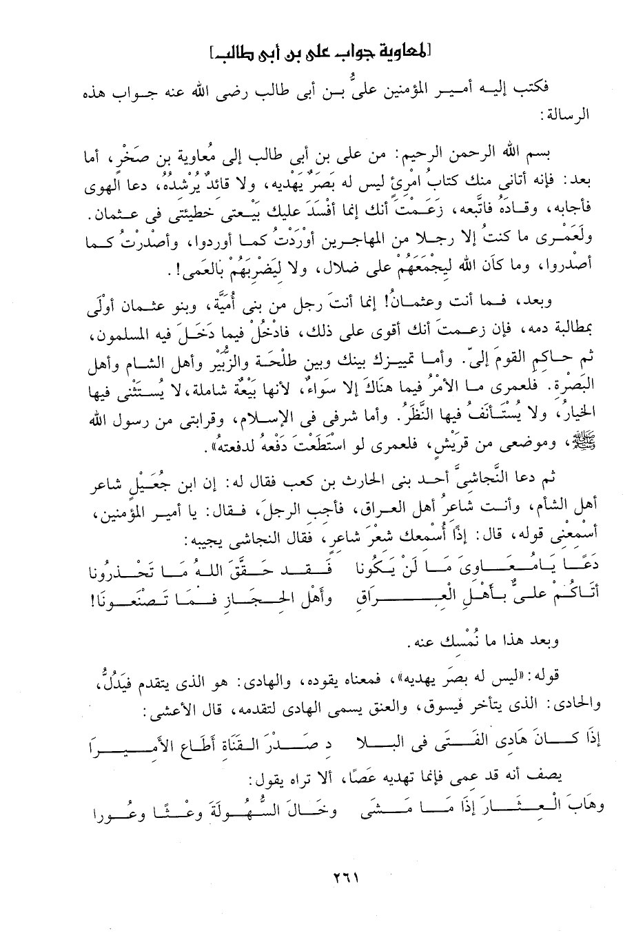 فكتب إليه أمير المؤمنين علي بن أبي طالب رضي الله عنه جواب هذه الرسالة: بسم الله الرحمن الرحيم، من علي بن أبي طالب إلى معاوية بن صخر، أما بعد: فإنه أتاني منك كتاب امرىء ليس له بصرٌ يهديه، ولا قائدٌ يرشده، دعاه الهوى فأجابه، وقاده فاتبعه، زعمت أنك إنما أفسد عليك بيعتي خطيئتي في عثمان. ولعمري ما كنت إلا رجلاً من المهاجرين أوردت كما أوردوا، وأصدرت كما أصدروا، وما كان الله ليجمعهم على ضلال، ولا ليضربهم بالعمى.