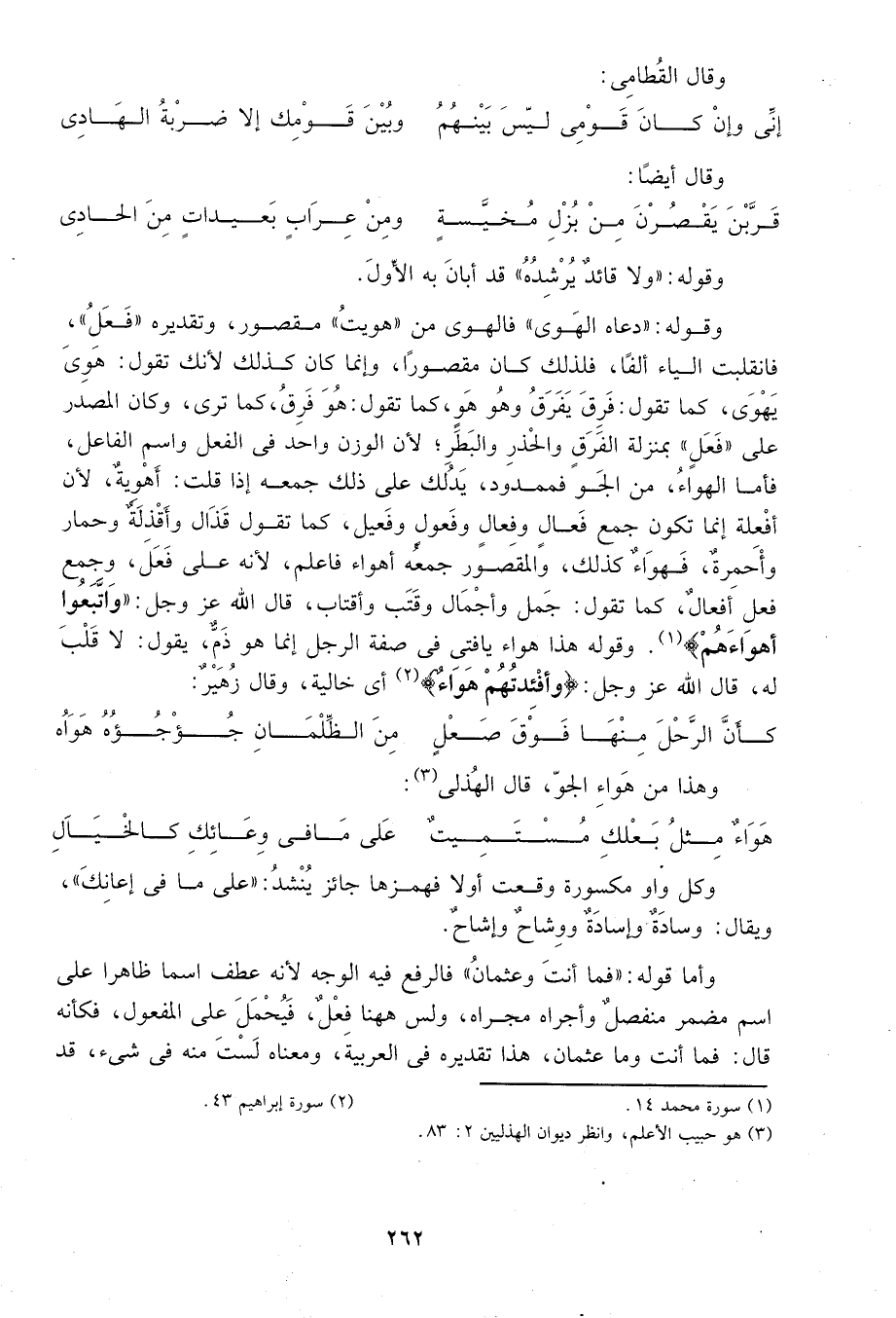 وقوله: "دعاه الهوى" فالهوى من" هويت" مقصور، وتقديره "فعل"، فانقلبت الياء ألفاً، فلذلك كان مقصوراً، وإنما كان كذلك لأنك تقول: هوي يهوى، كما تقول: فرق يفرق وهو هو، كما تقول: هو فرق، كما ترى، وكان المصدر على"فعل"، بمنزلة الفرق والحذر والبطر. لأن الوزن واحد في الفعل واسم الفاعل، فأما الهواء، من الجو فمدود، يدلك على ذلك جمعة إذا قلت: أهويةٌ، لأن أفعله إنما تكون جمع فعالٍ وفعالٍ وفعولٍ وفعيل، كما تقول قذالٌ وأقذلةٌ وحمار وأحمرةٌ، فهواءٌ كذلك، والمقصور جمعه أهواء فاعلم، لأنه على فعل، وجمع فعل أفعالٌ كما تقول: جمل وأجمال وقتب وأقتاب، قال الله عز وجل: {وَاتَّبَعُوا أَهْوَاءَهُمْ} 1. وقوله هذا هواء يا فتى في صفة الرجل إنما هو ذمٌ، يقول: لا قلب له، قال الله عز وجل: {وَأَفْئِدَتُهُمْ هَوَاء ٌ} 2 أي خالية، وقال زهير: