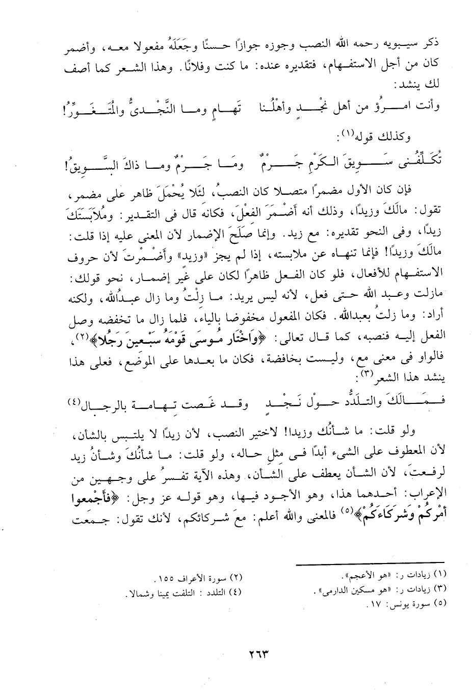 ولو قلت: ما شأنك وزيداً لا ختير النصب، لأن زيداً لا يلتبس بالشأن، لأن المعوطف على الشيء أبداً في مثل حاله، ولو قلت: ما شانك وشأن زيد لرفعت، لأن الشأن يعطف على الشأن، وهذه الآية تفسر على وجهين من الإعراب: أحدهما هذا، وهو الأجود فبها وهو قوله عز وجل: {فَأَجْمِعُوا أَمْرَكُمْ وَشُرَكَاءَكُمْ} 5. فالمعنى والله أعلم: مع شركائكم، لأنك تقول: جمعت