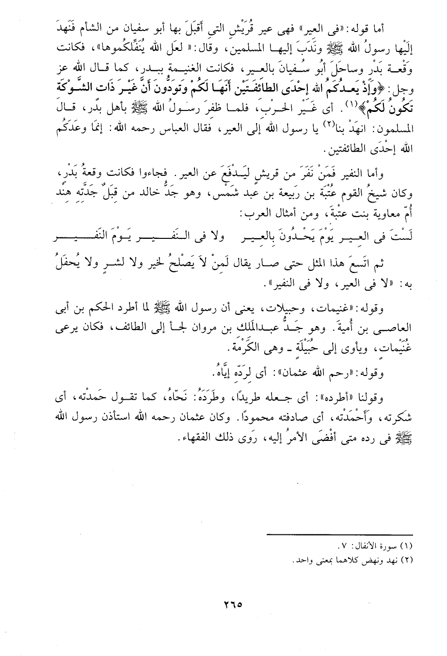 أما قوله: "في العير" فهي عير قريش التي أقبل بها أبو سفيان من الشأم فنهد إليها رسول الله صَلَّى اللَّهُ عَلَيْهِ وَسَلَّمَ وندب إليها المسلمين، وقال: "لعل الله ينفلكموها"، فكانت وقعة بدر، وساحل أبو سفيان بالعير، فكانت الغنيمة ببدر، كما قال الله عز وجل: {وَإِذْ يَعِدُكُمُ اللَّهُ إِحْدَى الطَّائِفَتَيْنِ أَنَّهَا لَكُمْ وَتَوَدُّونَ أَنَّ غَيْرَ ذَاتِ الشَّوْكَةِ تَكُونُ لَكُمْ} 1. أي غير الحرب، فلما ظفر رسول الله صَلَّى اللَّهُ عَلَيْهِ وَسَلَّمَ بأهل بدر، قال المسلمون: انهد بنا2 يا رسول الله إلى العير، فقال العباس رحمه الله: إنما وعدكم الله إحدى الطائفتين.