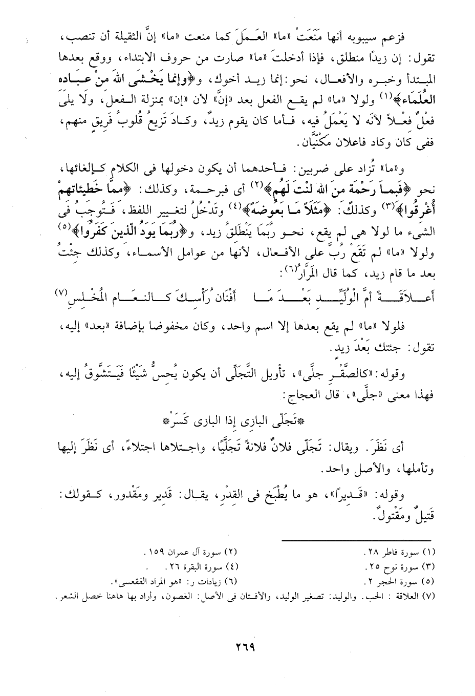 و"ما" تزاد على ضربين، فأحدهما أن يكون دخولها في الكلام كإلغائها، نحو {فَبِمَا رَحْمَةٍ مِنَ اللَّهِ لِنْتَ لَهُمْ} 2 أي فبرحمة، وكذلك: {مِمَّا خَطِيئَاتِهِمْ أُغْرِقُوا} 3 وكذلك {مَثَلاً مَا بَعُوضَةً} 4 وتدخل لتغيير اللفظ، فتوجب في الشيء ما لولا هي لم يقع، نحو ربما ينطلق زيد، و {رُبَمَا يَوَدُّ الَّذِينَ كَفَرُوا} 5، ولولا" ما" لم تقع رب على الأفعال، لأنها من عوامل الأسماء، وكذلك جئت بعد ما قام زيد، كما قال المرار6: