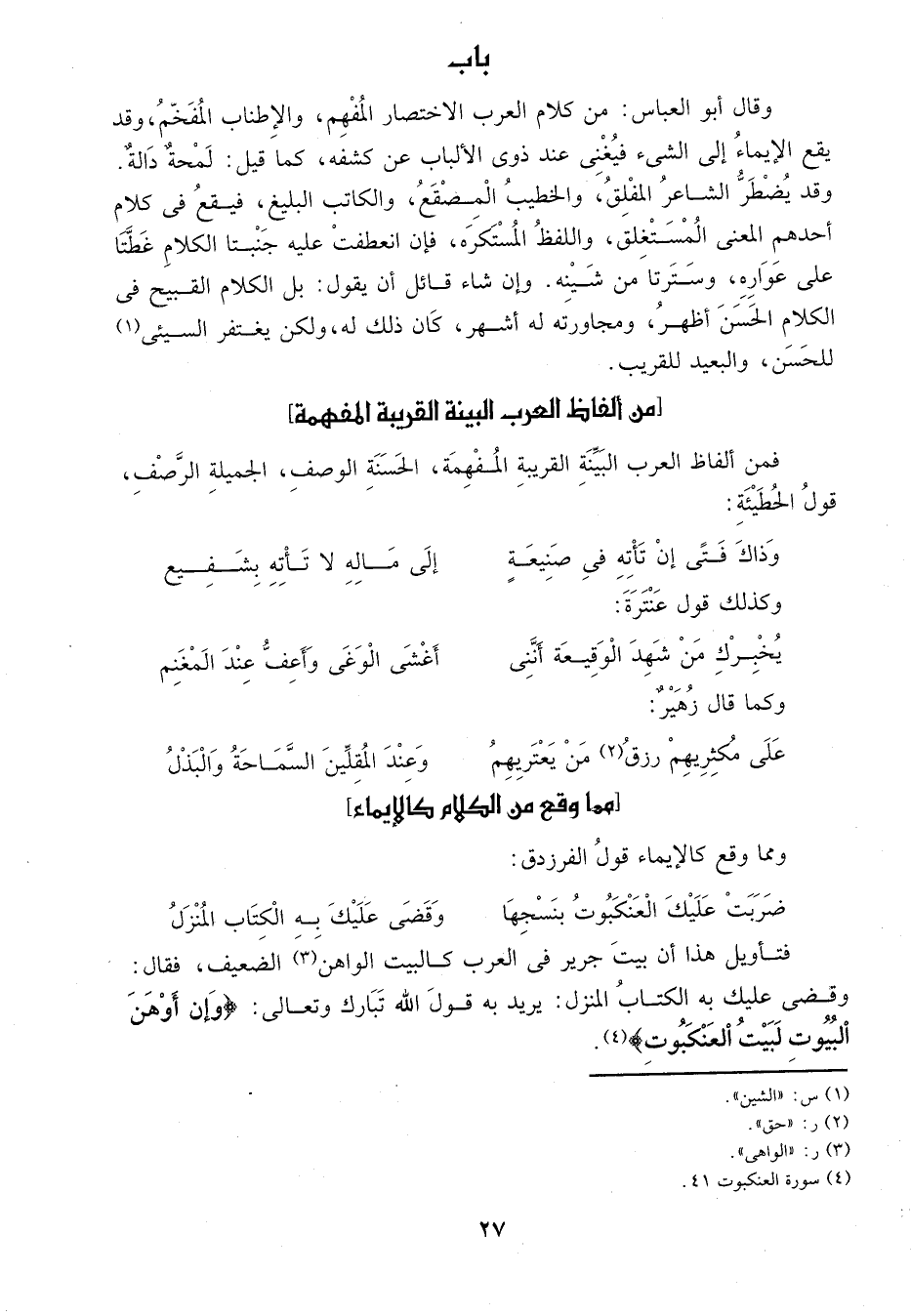 فمن ألفاظ العرب البينة القربية المفهمة، الحسنة الوصف، الجميلة الرصف قول الحطيئة: