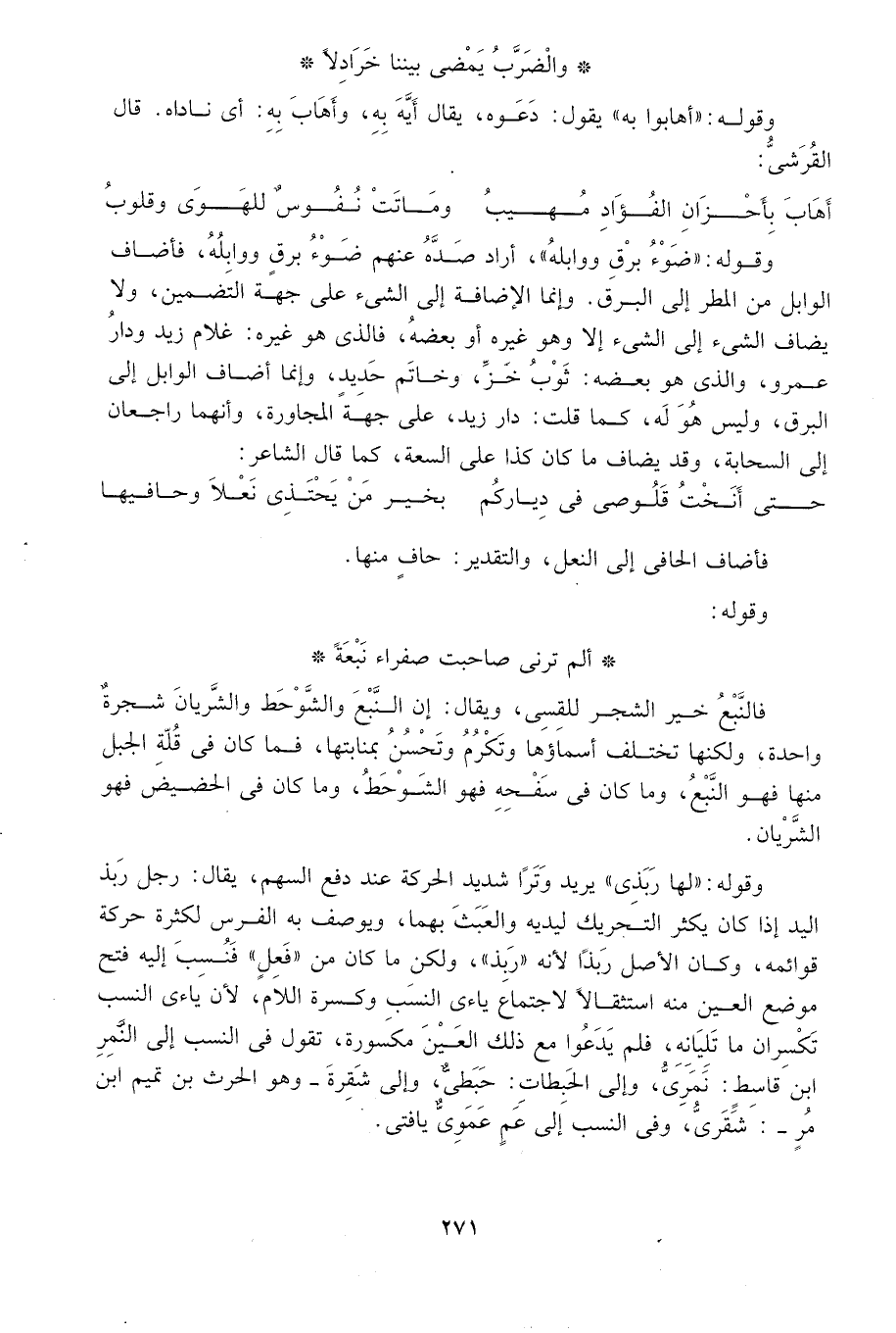 وقوله: "لها ربذي"، يريد وتراً شديد الحركة عند دفع السهم، يقال رجل ربذ اليد إذا كان يكثر التحريك ليديه والعبث بهما، ويوصف به الفرس لكثرة حركة قوائمه، وكان الأصل ربذاً لأنه" ربذ"، ولكن ما كان من "فعل" فنسب إليه فتح موضع العين منه استثقالاً لاجتماع ياءي النسب وكسرة اللام، لأن ياءي النسب تكسران ما تليانه، فلم يدعوا مع ذلك العين مكسورة، تقول في النسب إلى النمر بن قاسط: نمري، وإلى الحطبات: حبطي، وإلى شقرة وهو الحارث ابن تميم بن مر: شقري، وفي النسب إلى عم عموي يا فتى.