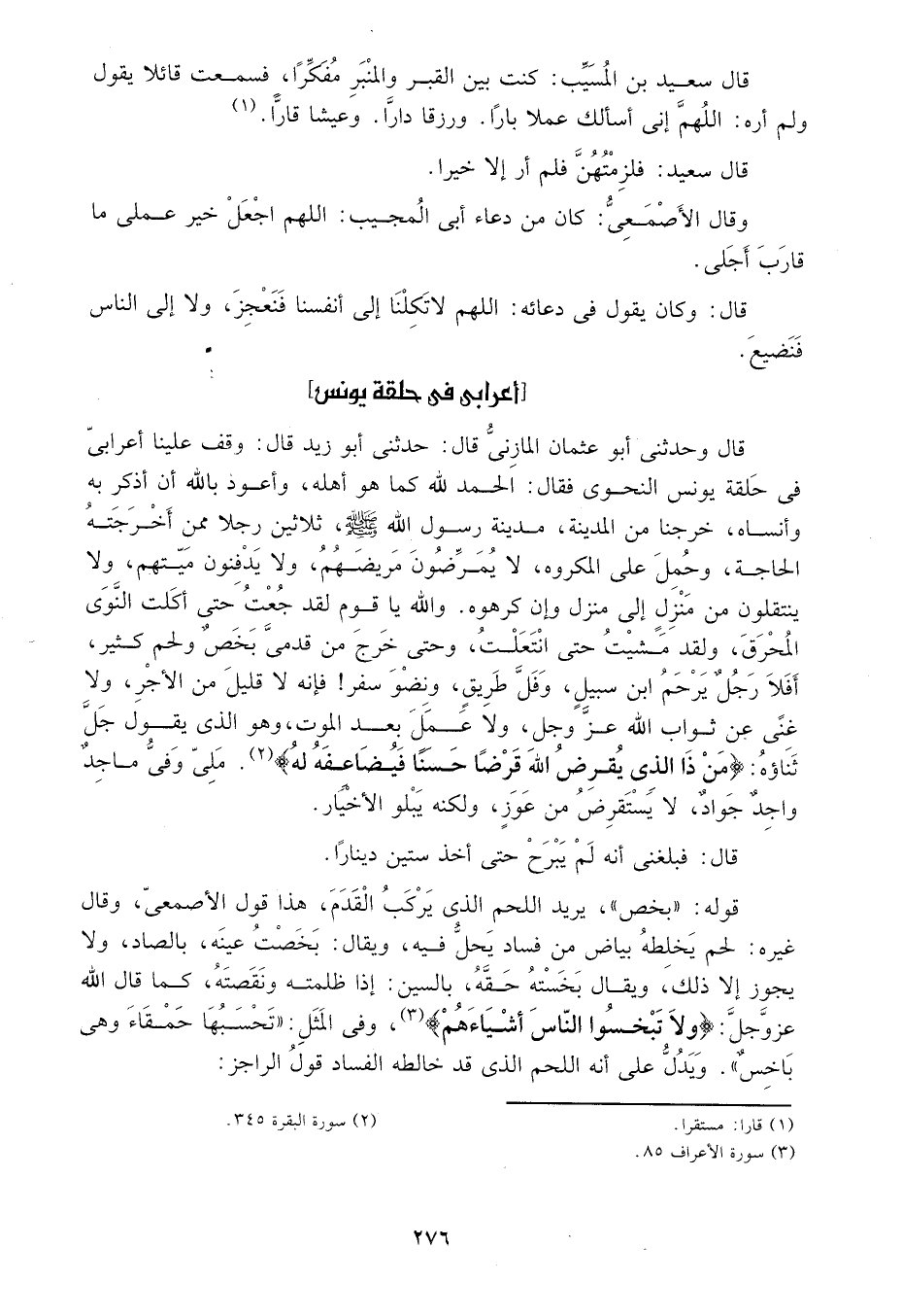 قال: وحدثني أبو عثمان المازني قال: حدثني أبو زيد قال: وقف علينا أعرابي في حلقة يونس النحوي فقال: الحمد لله كما هو أهله، وأعوذ بالله أن أذكر به وأنساه، خرجنا من المدينة، مدينة رسول الله صلى الله عليه سلم، ثلاثين رجلاً ممن أخرجته الحاجة، وحمل على المكروه، لا يمرضون مريضهم، ولا يدفنون ميتهم، ولا ينتقلون من منزلٍ إلى منزل وإن كرهوه. والله يا قوم لقد جعت حتى أكلت النوى المحرق، ولقد مشيت حتى انتعلت، وحتى خرج من قدمي بخص ولحم كثير. أفلا رجل يرحم ابن سبيل، وفل طريق، ونضو سفر فإنه لا قليل من الأجر، ولا غنى عن ثواب الله عز وجل، ولا عمل بعد الموت، وهو الذي يقول جل ثناؤه: {مَنْ ذَا الَّذِي يُقْرِضُ اللَّهَ قَرْضاً حَسَناً فَيُضَاعِفَهُ لَهُ} 2 ملي وفي ماجد واجد جوادٌ، لا يستقرض من عوزٍ، ولكنه يبلو الأخيار. قال: فبلغني أنه لم يبرح حتى أخذ ستين ديناراً.