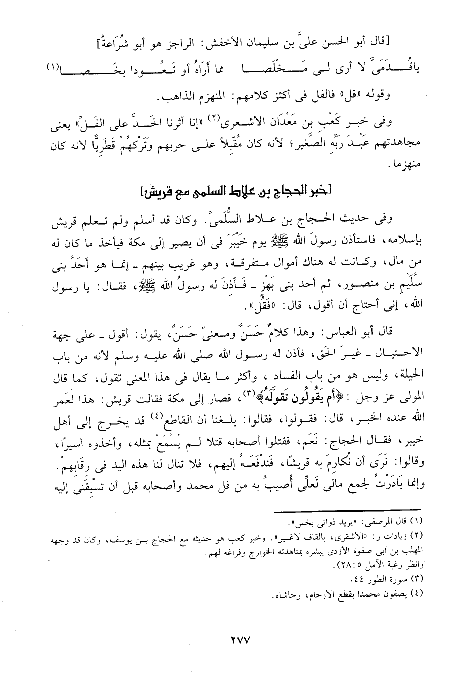 قال أبو العباس: وهذا كلام حسن ومعنى حسن، يقول: أقول على جهةالاحتيال غير الحق، فأذن له رسول الله صَلَّى اللَّهُ عَلَيْهِ وَسَلَّمَ لأنه من باب الحيلة، وليس هو من باب الفساد، وأكثر ما يقال في هذا المعنى تقول، كما قال المولى عز وجل: {أَمْ يَقُولُونَ تَقَوَّلَهُ} 2 فصار إلى مكة فقالت قريش: هذا لعمر الله عنده الخبر. قال: فقولوا: بلغنا أن القاطع4 قد يخرج إلى أهل خيبر، فقال الحجاج: نعم، فقتلوا أصحابه قتلاً لم يسمع بمثله، وأخذوه أسيراً، وقالوا: نرى أن نكارم به قريشاً، فندفعه إليهم، فلا تنال لنا هذه اليد في رقابهم. وإنما بادرت لجمع مالي لعلي أصيب به من فل محمدٍ وأصحابه قبل أن تسبقني إليه