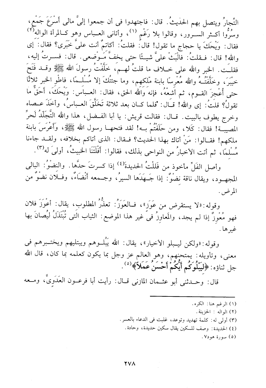 وقوله: "لا يستقرض من عوزٍ"، فالعوز: تعذر المطلوب، يقال: أعوز فلان فهو معوز إذا لم يجد، والمعاوز في غير هذا الموضع: الثياب التي تبتذل ليصان بها غيرها. وقوله: "ولكن ليبلوا الأخيار"، يقال: الله يبلوهم ويبتليهم ويختبرهم في معنى، وتأويله: يمتحنهم، وهو العالم عز وجل بما يكون كعلمه بما كان، قال ال جلله ثناؤه {لِيَبْلُوَكُمْ أَيُّكُمْ أَحْسَنُ عَمَلاً} 5 قال: وحدثني أبو عثمان المازني قال: رأيت أبا فرعون العدوي، ومعه