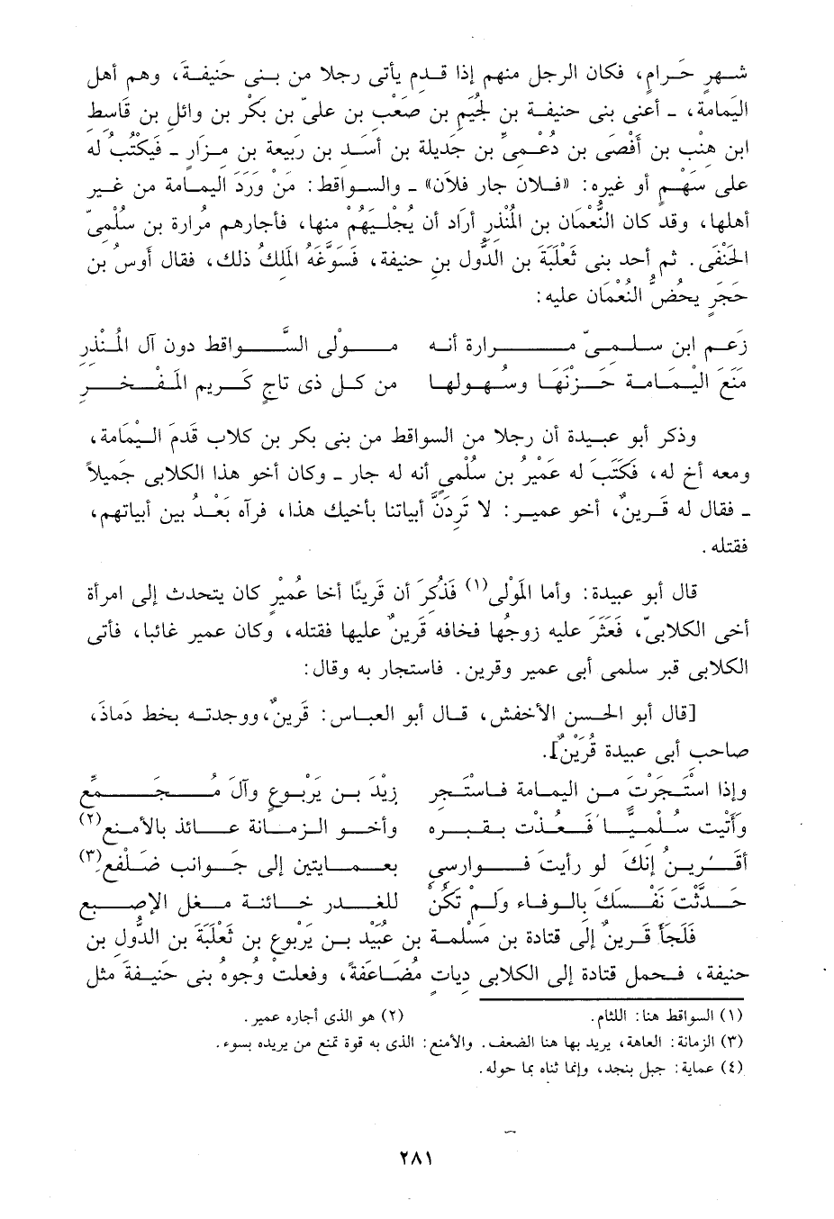 قال أبو العباس: قرأت على عبد الله بن محمد المعروف بالتوزي عن أبي عبيدة معمر بن المثنى التيمي، قال: كانت السواقط ترد اليمامة في الأشهر الحرم لطلب التمر، فإن وافقت ذلك، وإلا أقامت بالبلد إلى أوانه، ثم تخرج منه فيشهر حرام، فكان الرجل منهم إذا قدم يأتي رجلً من بني حنيفة، وهم أهل اليمامة، أعني بني حنيفة بن لجيم بن صعب بن علي بن بكر بن وائل بن قاسط ابن هنب بن أفصى بن دعمي بن جديلة بن أسد بن ربعة بن نزار فيكتب له على سهم أو غيره: "فلان جار فلان" والسواقط: من ورد اليمامة من غير أهلها، وقد كان النعمان بن المنذر أراد أن يجليهم منها، فأجارهم مرارة بن سلمي الحنفي.