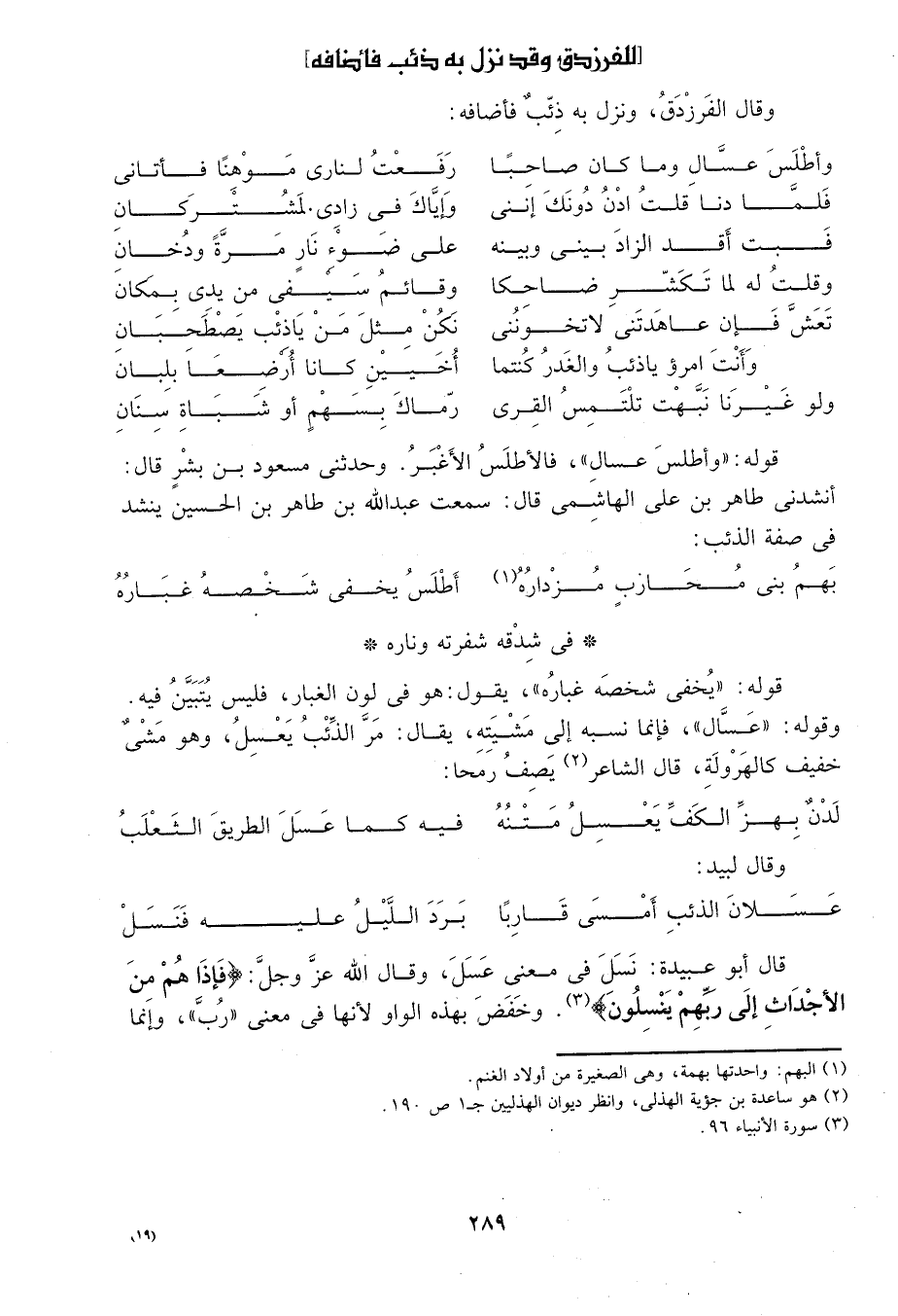 عسلان الذئب أمسى قارباً ... برد الليل عليه فنسل