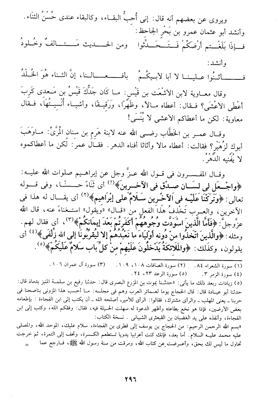 "بسم الله الرحمن الرحيم: من الحجاج بن يوسف إلى قطرى بن الفجاءة، سلام عليك، الموحد الله، والمصلى عليه محمد عليه السلام. أما بعد، فإنك كنت أعرابيا يدويا تستطعم الكسرة، وتحف إلى التمرة، ثم خرجت تحاول ماليس لك بحق، وأعرضت عن كتاب الله، ومرقت من سنة رسول الله صَلَّى اللَّهُ عَلَيْهِ وَسَلَّمَ، فارجع عما......=