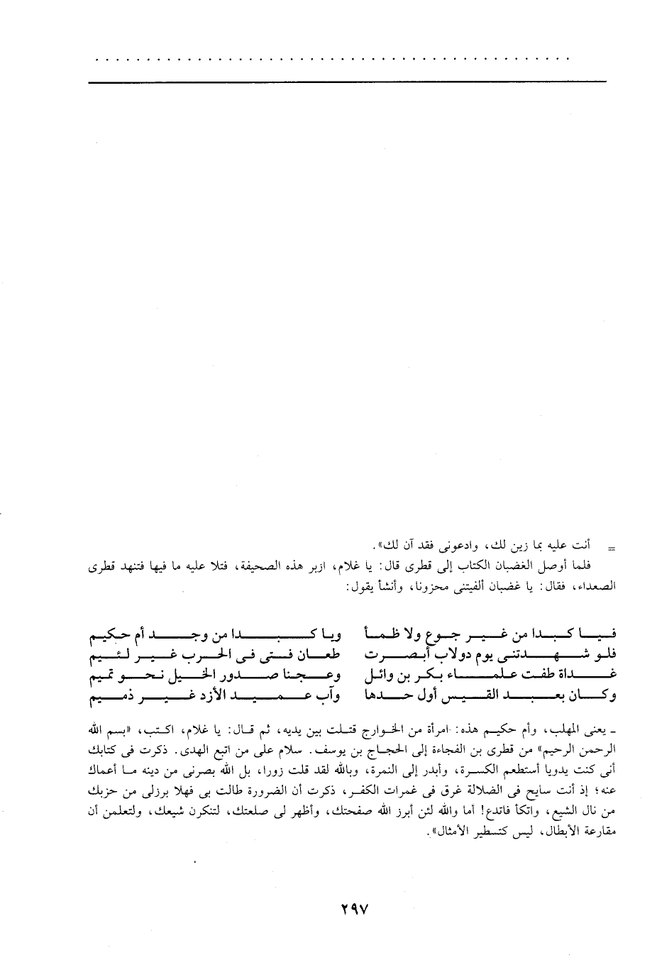 -يعنى المهلب، وأم حكيم هذه: امرأة من الخوارج قتلت بين يديه، ثم قال: ياغلام، اكتب، "بسم الله الرحمن الرحيم" من قطرى بن الفجاءة إلى الحجاج بن يوسف. سلام على من اتبع الهدى. ذكرت في كتابك أنى كنت يدويا أستطعم الكسرة، وأبدر إلى النمرة، وبالله لقد قلت زورا، بل الله بصرنى من دينه ما أعماك عنه؛ إذ أنت سايح في الضلالة غرق في غمرات الكفر، ذكرت أن الضرورة طالت بى فهلا برزلى من حزبك من نال الشيع، واتكأ فاتدع! أما والله لئن أبرز الله صفحتك، وأظهر لى صلعتك، لتنكرن شيعك، ولتعلمن أن مقارعة الأبطال، ليس كتسطير الأمثال".