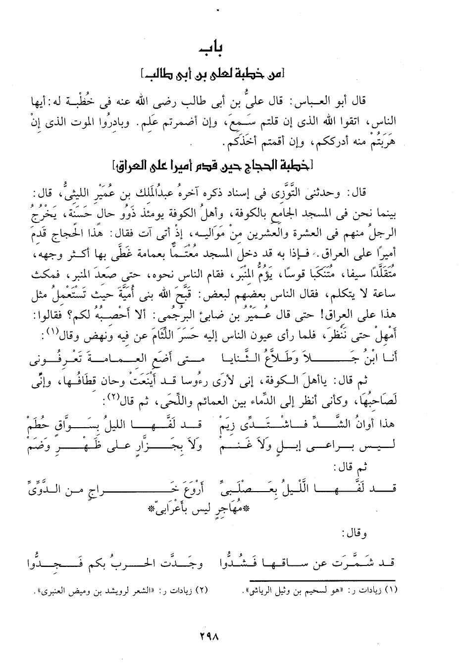 قال: وحدثني التوزي في إسناد ذكره آخره عبد الملك بن عمير الليثي، قال: بينما نحن في المسجد الجامع بالكوفة، وأهل الكوفة يومئذ ذوو حالٍ حسنةٍ، يخرج الرجل منهم في العشرة والعشرين من مواليه، إذ أتى آتٍ فقال: هذا الحجاج قدم أميراٌ على العراق. فإذا به قد دخل المسجد معتماٌ بعمامة غطى بها أكثر وجهه، متقلداٌ سيفاً، متنكباٌ قوساٌ، يؤم المنبر، فقام الناس نحوه، حتى صعد المنبر، فمكث ساعة لا يتكلم، فقال الناس بعضهم لبعض: قبح الله بني أمية حيث تستعمل مثل هذا على العراق حتى قال عمير بن ضابيء البرجمي: ألاأحصبه لكم? فقالوا: أمهل حتى ننظر، فلما رأى عيون الناس إليه حسر اللثام عن فيه ونهض وقال1: