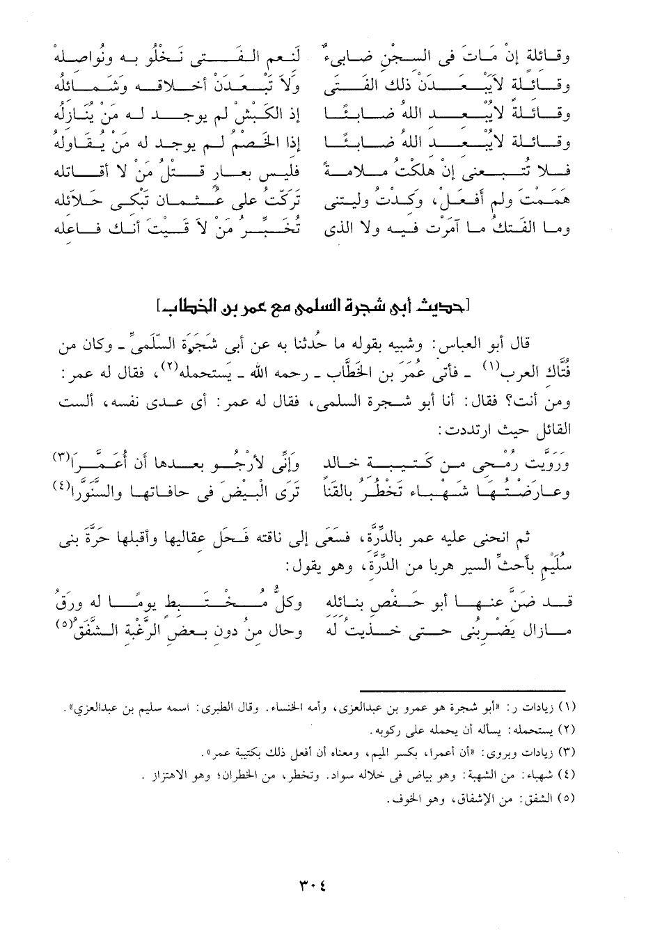 قال أبو العباس: وشبيه بقوله ما حدثنا به عن أبي شجرة السلمي وكان من فتاك العرب1 فأتى عمر بن الخطاب رحمه الله يستحمله2، فقال له عمر: ومن أنت? فقال: أنا أبو شجرة السلمي، فقال له عمر: أي عدي نفسه، ألست القاتل حيث ارتددت: