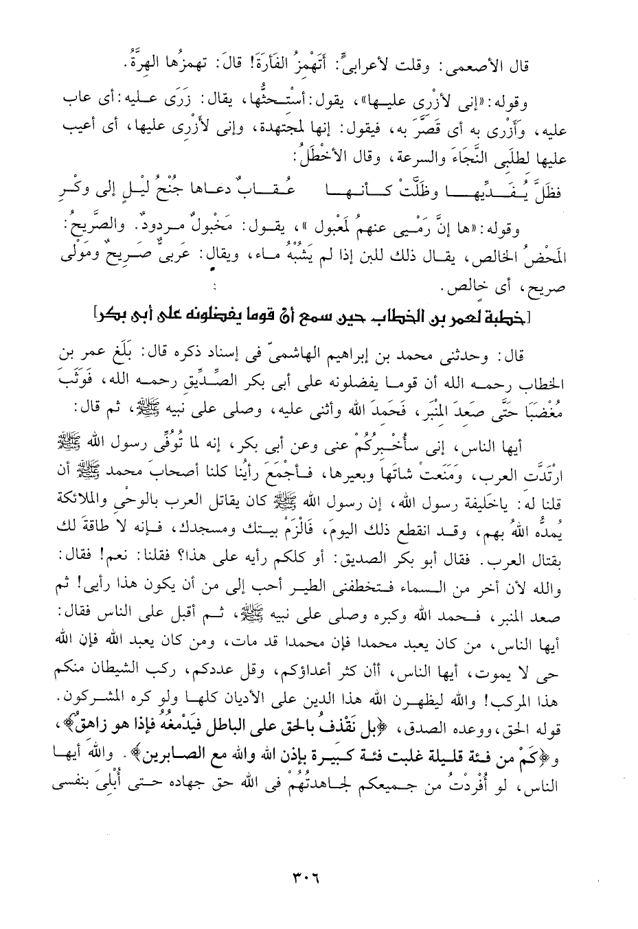 أيها الناس، إني سأخبركم عني وعن أبي بكر، إنه لما توفي رسول الله صَلَّى اللَّهُ عَلَيْهِ وَسَلَّمَ اردتدت العرب، ومنعت شاتها وبعيرها، فأجمع رأينا كلنا أصحاب محمد صَلَّى اللَّهُ عَلَيْهِ وَسَلَّمَ أن قلنا له: يا خليفة رسول الله، أن رسول الله صَلَّى اللَّهُ عَلَيْهِ وَسَلَّمَ كان يقاتل العرب بالوحي والملائكة يمده الله بهم، وقد انقطع ذلك اليوم، فالزم بيتك ومسجدك، فإنه لاطاقة لك بقتال العرب. فقال أبو بكر الصديق: أو كلكم رأيه على هذا ? فقلنا: نعم فقال: والله لأن أخر من السماء فتخطفني الطير أحب إلي من أن يكون هذا رأيي ثم صعد المنبر، فحمد الله وكبره وصلى على نبيه صلى عليه وسلم، ثم أقبل على الناس فقال: أيها الناس، من كان يعبد محمداٌ فإن محمداٌ قد مات، ومن كان يعبد الله فإن الله حي لايموت. أيها الناس، أإن كثر أعداؤكم، وقل عددكم، ركب الشيطان منكم هذا المركب? والله ليظهرن الله هذا الدين على الأديان كلها ولو كره المشركون. قوله الحق، ووعده الصدق، {بَلْ نَقْذِفُ بِالْحَقِّ عَلَى الْبَاطِلِ فَيَدْمَغُهُ فَإِذَا هُوَ زَاهِقٌ} ، و {كَمْ مِنْ فِئَةٍ قَلِيلَةٍ غَلَبَتْ فِئَةً كَثِيرَةً بِإِذْنِ اللَّهِ وَاللَّهُ مَعَ الصَّابِرِينَ} . والله أيها الناس، لو أفردت من جميعكم لجاهدتهم في حق جهاده حتى أبلي بنفسي