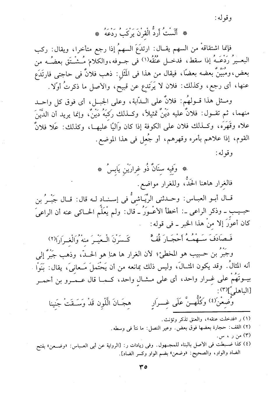 وجبر بن حبيب هو المخطىء، لأن الغرار ههنا هو الحد، وذهب جبر إلى أنه المثال، وقد يكون المثال، وليس ذلك بمانعه من أن يحتمل معاني، يقال: بنوا بيوتهم على غرار واحد، أي على مثال واحد، كما قال عمرو بن أحمر" الباهلي"3: