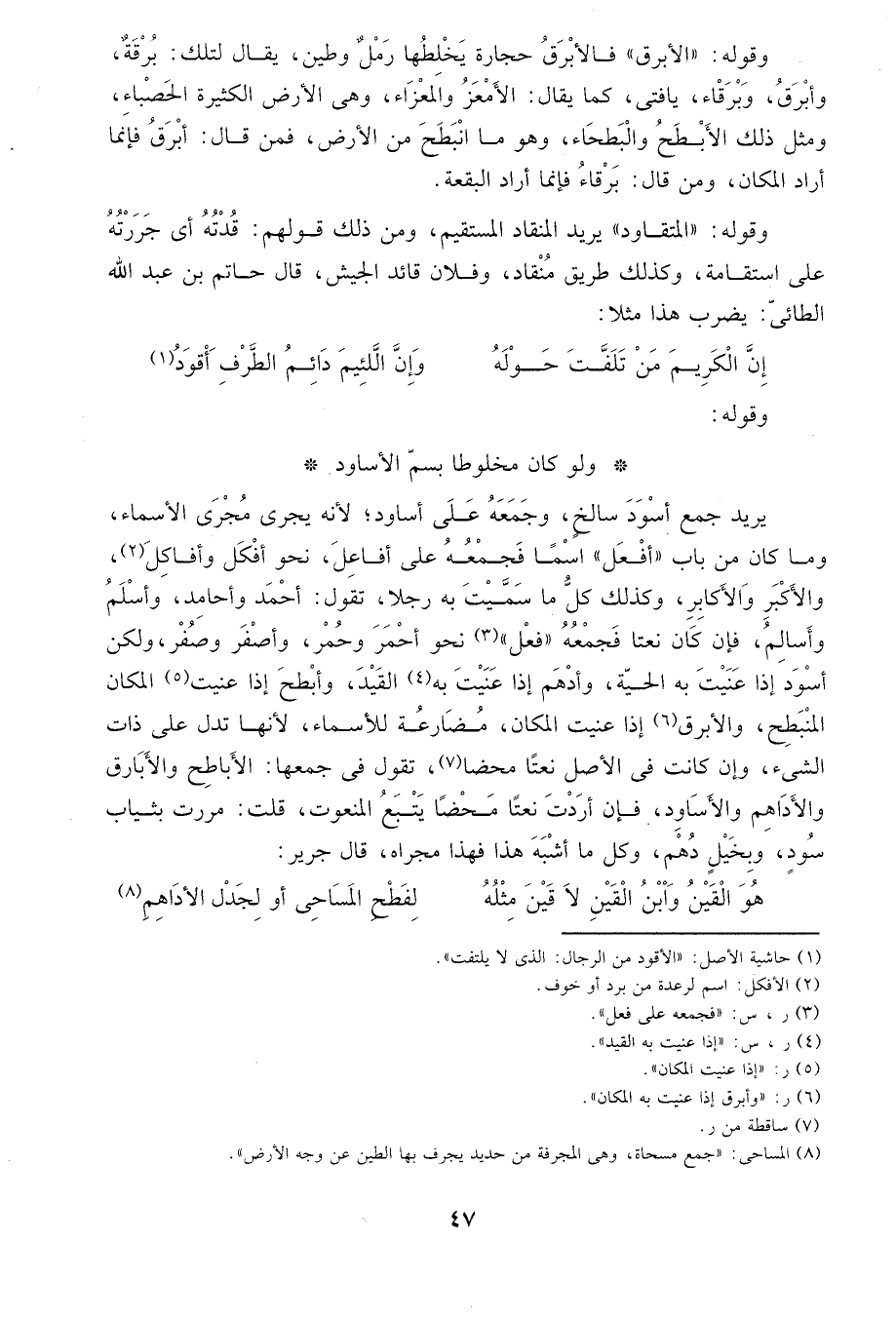 يريد جمع أسود سالخ، وجمعه على أساود، لأنه يجري مجرى الأسماء، وما كان من باب "أفعل" اسما فجمعه على أفاعل، نحو أفكل وأفاكل2، والأكبر والأكابر، وكذلك كل ما سميت به رجلاً، تقول: أحمد وأحامد وأسلم وأسالم، فإن كان نعتاً فجمعه" فعل"3 نحو أحمر وحمر وأصفر وصفر، ولكن أسود إذا عنيت به الحية، وأدهم إذا عنيت به4 القيد، وأبطح إذا عنيت5 المكان المنبطح، والأبرق6 إذا عنيت المكان، مضارعة للأسماء، لأنها تدل على ذات الشيء، وإذا كانت في الأصل نعتاً محضاً7، تقول في جمعها: الأباطح والأبارق والأداهم والأساود، فإن أردت نعتاً محضاً يتبع المنعوت، قلت: مررت بثياب سود، وبخيل دهم، وكل ما أشبه هذا فهذا مجراه، قال جرير: